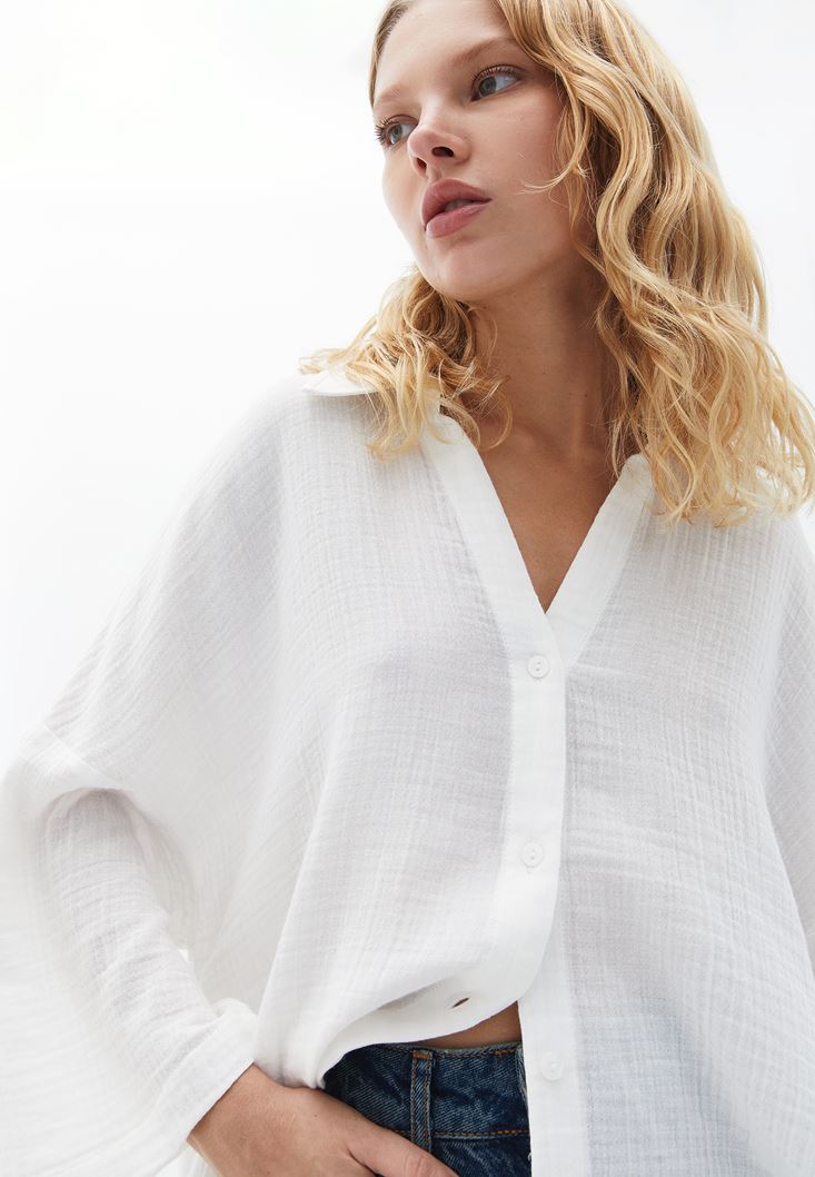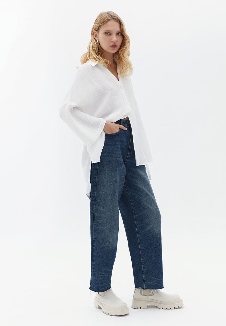 %100 pamuklu doğal doku, bedenden uzak oversize fit, yarım kollu, düğme kapamalı, önü kısa arkası uzun asimetrik kesim.