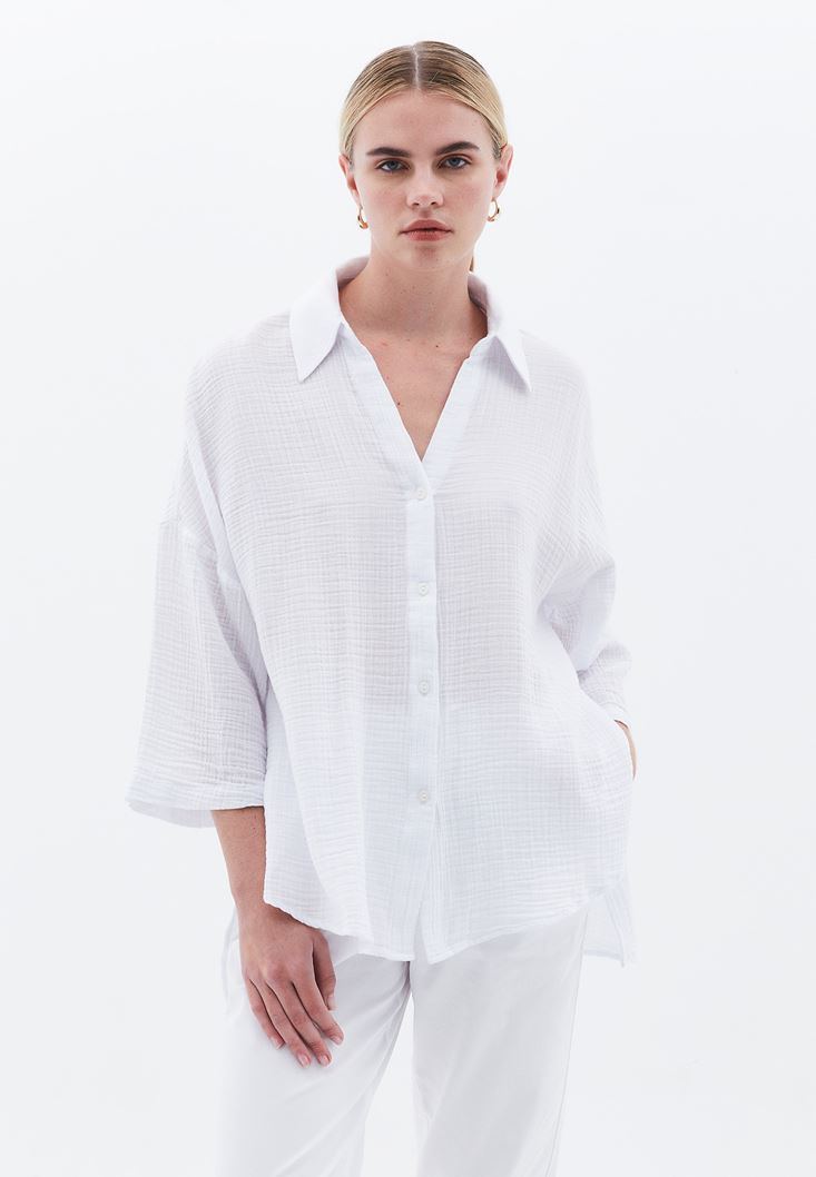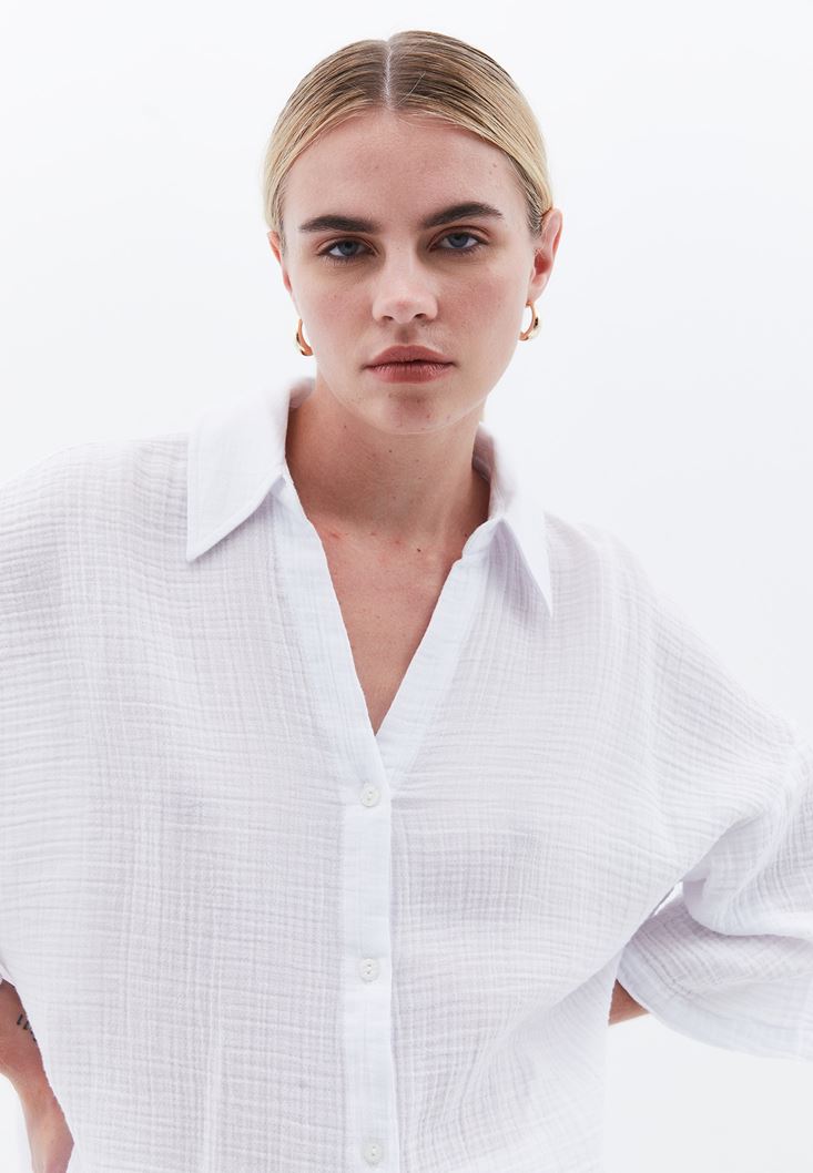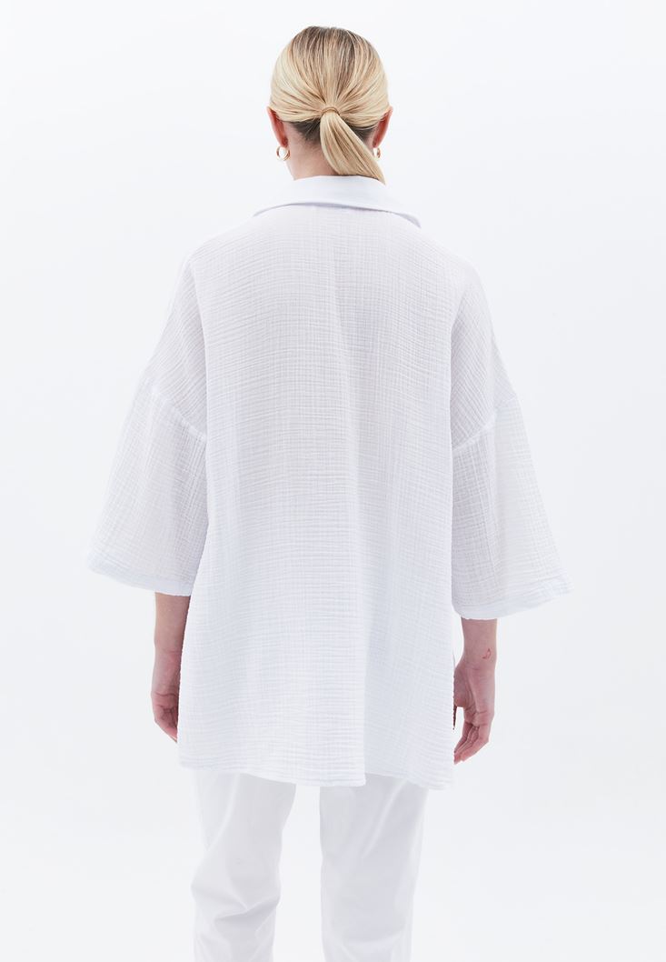 %100 pamuklu doğal doku, bedenden uzak oversize fit, yarım kollu, düğme kapamalı, önü kısa arkası uzun asimetrik kesim.
