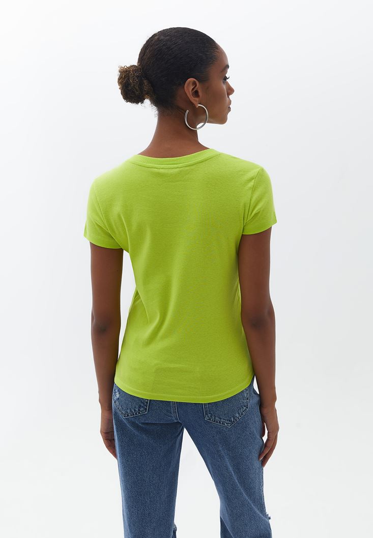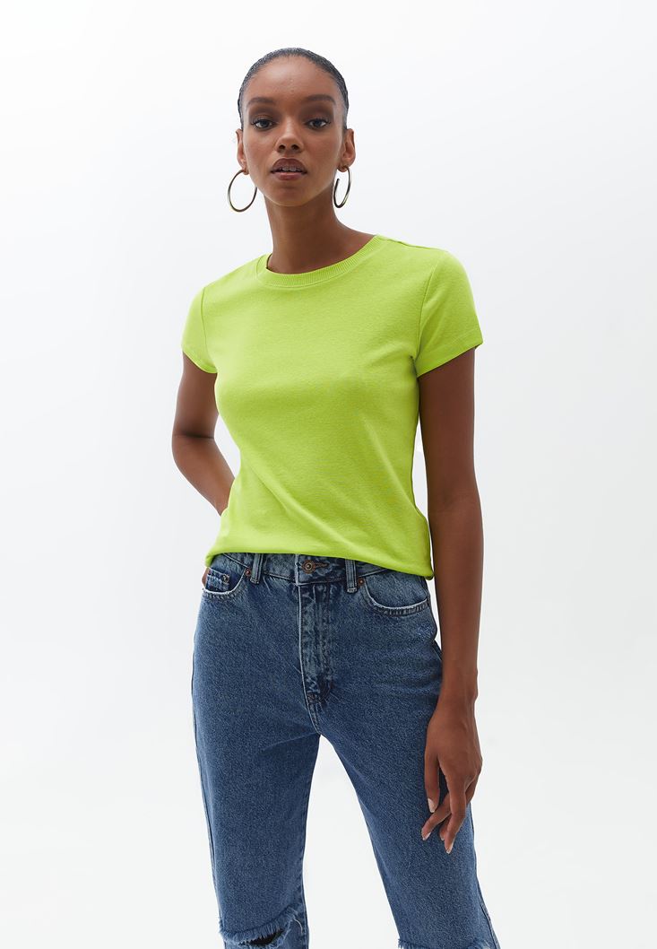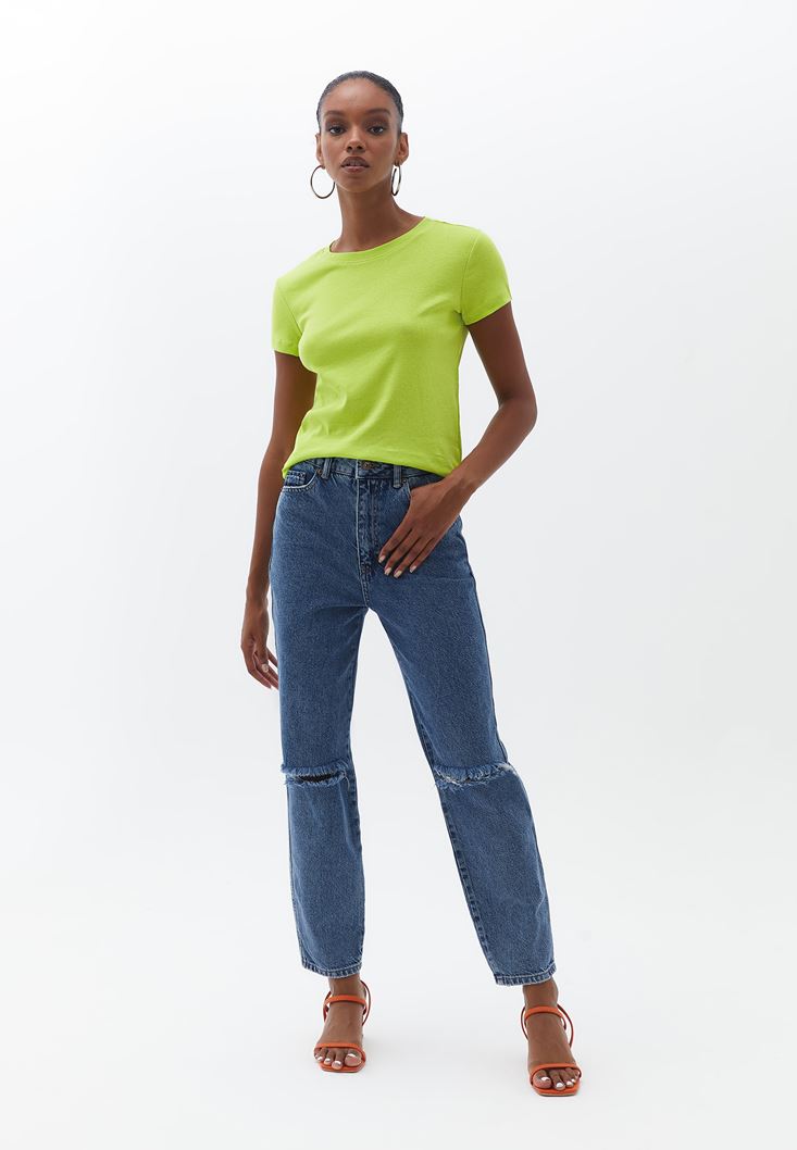 Pamuklu Sıfır Yaka Tişört ve Mom-Fit Pantolon Kombini