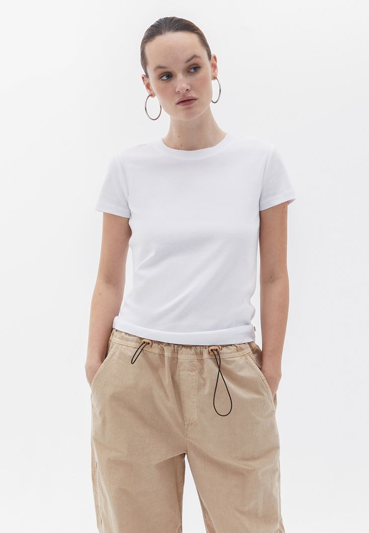 %100 pamuk içerikli doğal doku, sıfır yaka, kısa kollu, bedene yakın fit, yakası jakarlı.