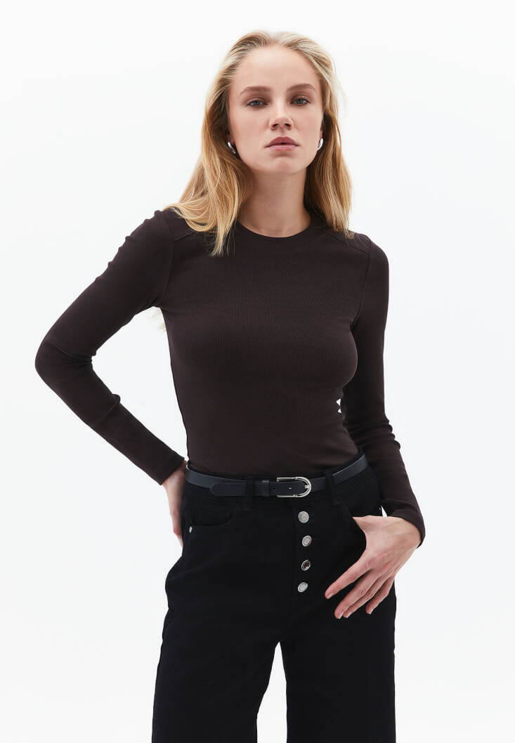 Pamuk karışımlı jakarlı doku, bedeni saran esnek fit, sıfır yaka, uzun kollu.