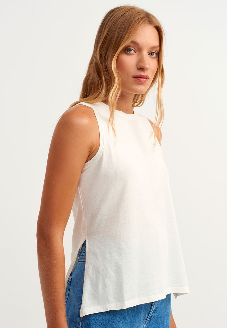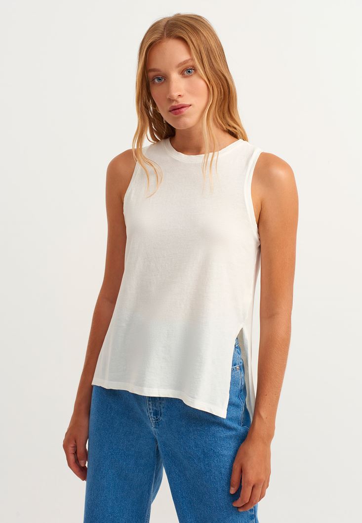 • Bayan Krem Pamuklu Sıfır Yaka Yırtmaçlı Atlet