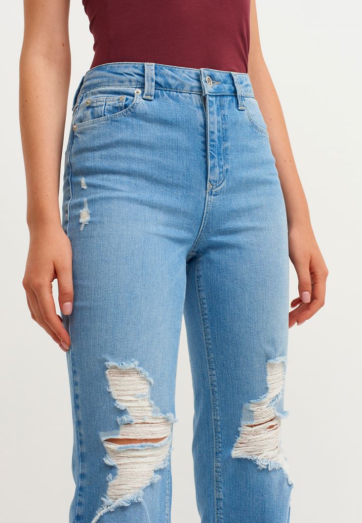Pamuk içerikli denim doku, ultra yüksek bel, boru paça, bedene yakın rahat kalıp, bilekte biten paça boyu.