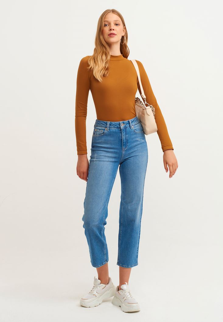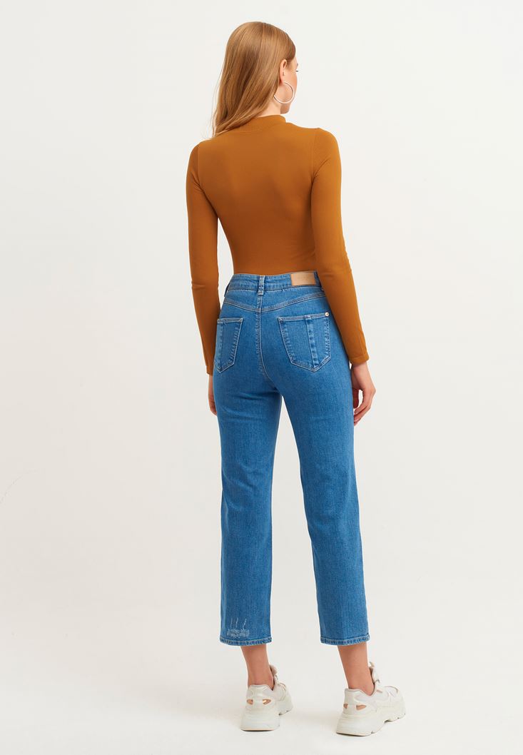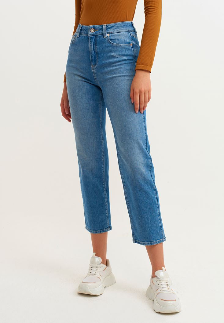 Pamuk içerikli denim doku, ultra yüksek bel, boru paça, bedene yakın rahat kalıp, bilekte biten paça boyu.