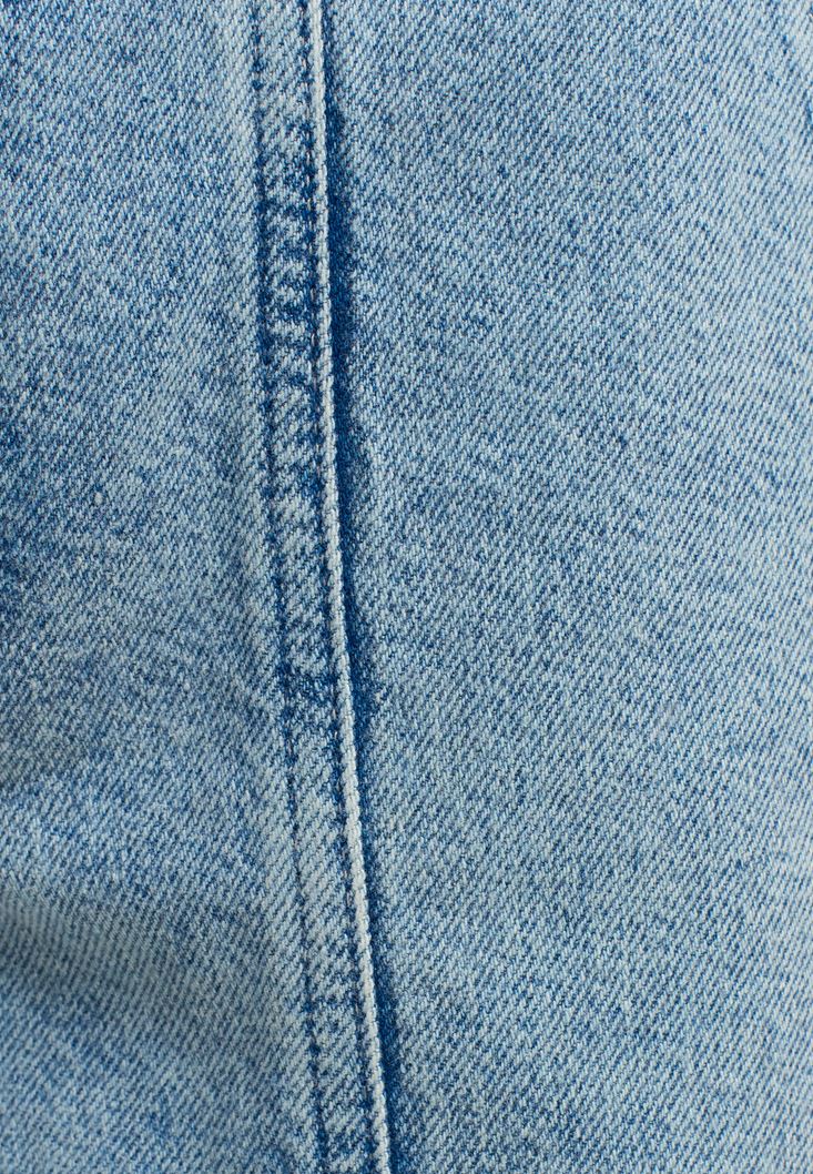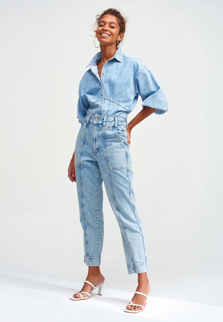 %100 pamuklu, slim-fit, straight paça, ultra yüksek bel, yıkamalı görünüm, ön cepleri ve paçaları dikiş detaylı.