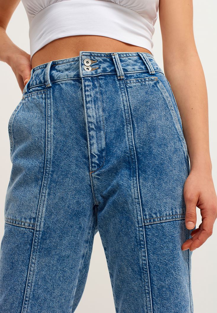%100 pamuklu, slim-fit, straight paça, ultra yüksek bel, yıkamalı görünüm, ön cepleri ve paçaları dikiş detaylı.