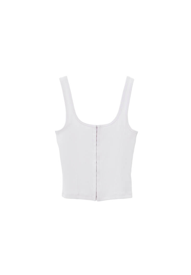 Pamuk karışımlı içerik, bedeni saran esnek fit, U yaka, kalın askılı, ön kısmı kopça kapamalı, jakarlı doku.