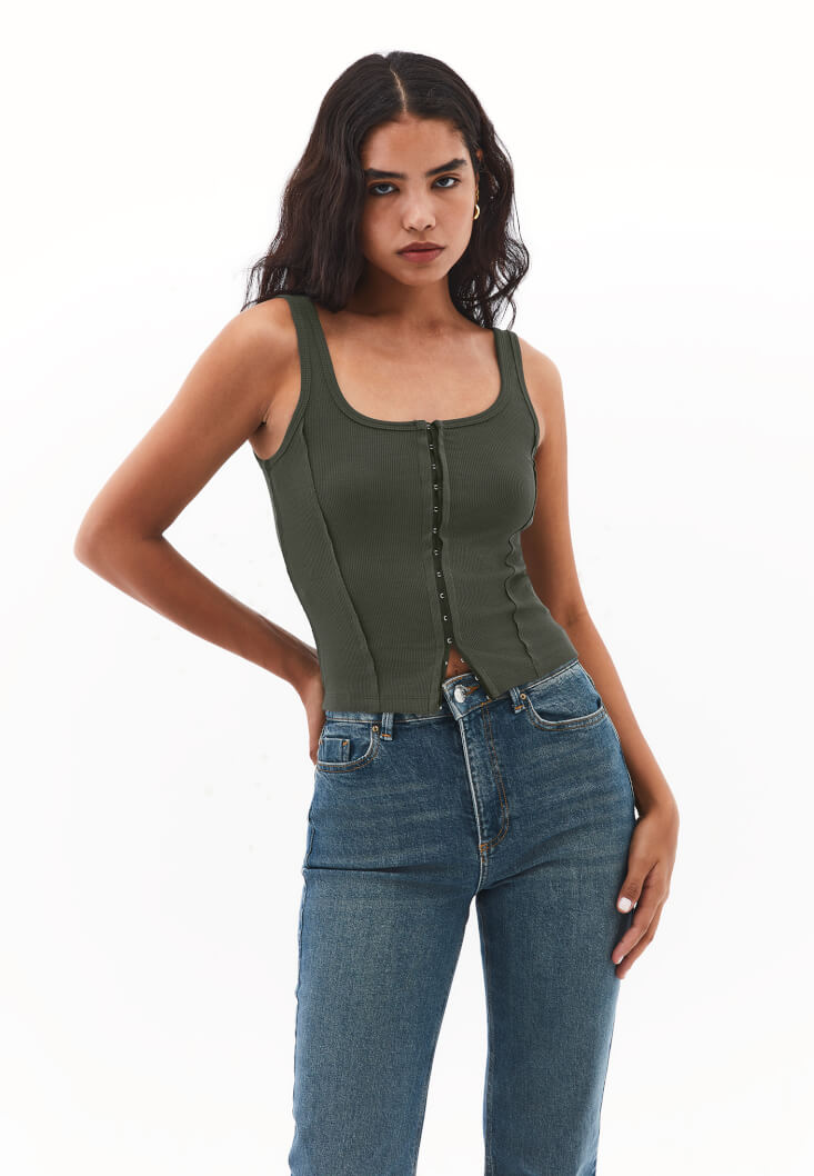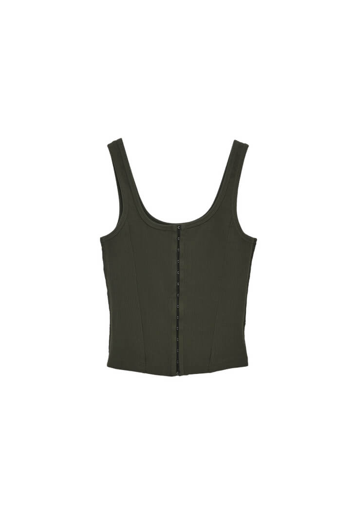 Pamuk karışımlı içerik, bedeni saran esnek fit, U yaka, kalın askılı, ön kısmı kopça kapamalı, jakarlı doku.