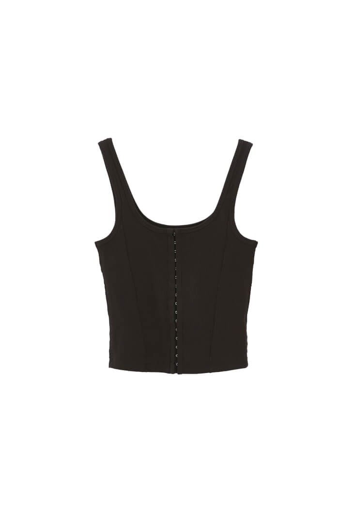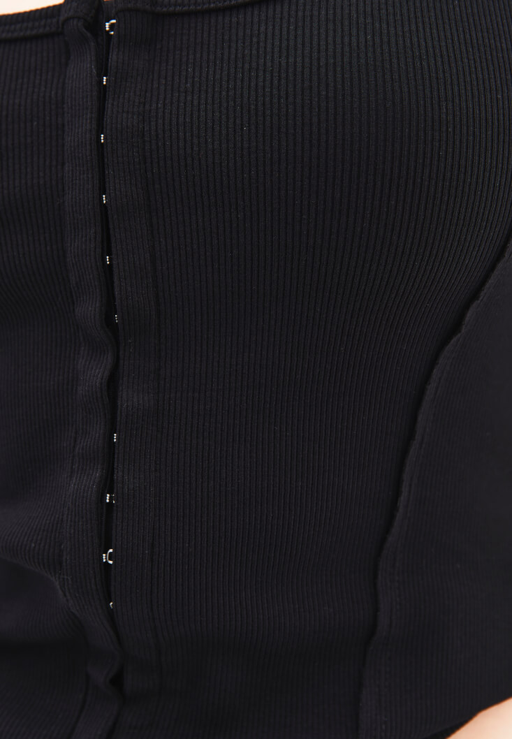 Pamuk karışımlı içerik, bedeni saran esnek fit, U yaka, kalın askılı, ön kısmı kopça kapamalı, jakarlı doku.