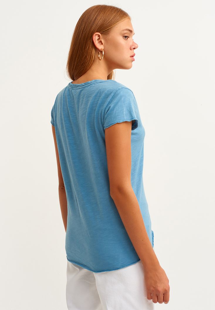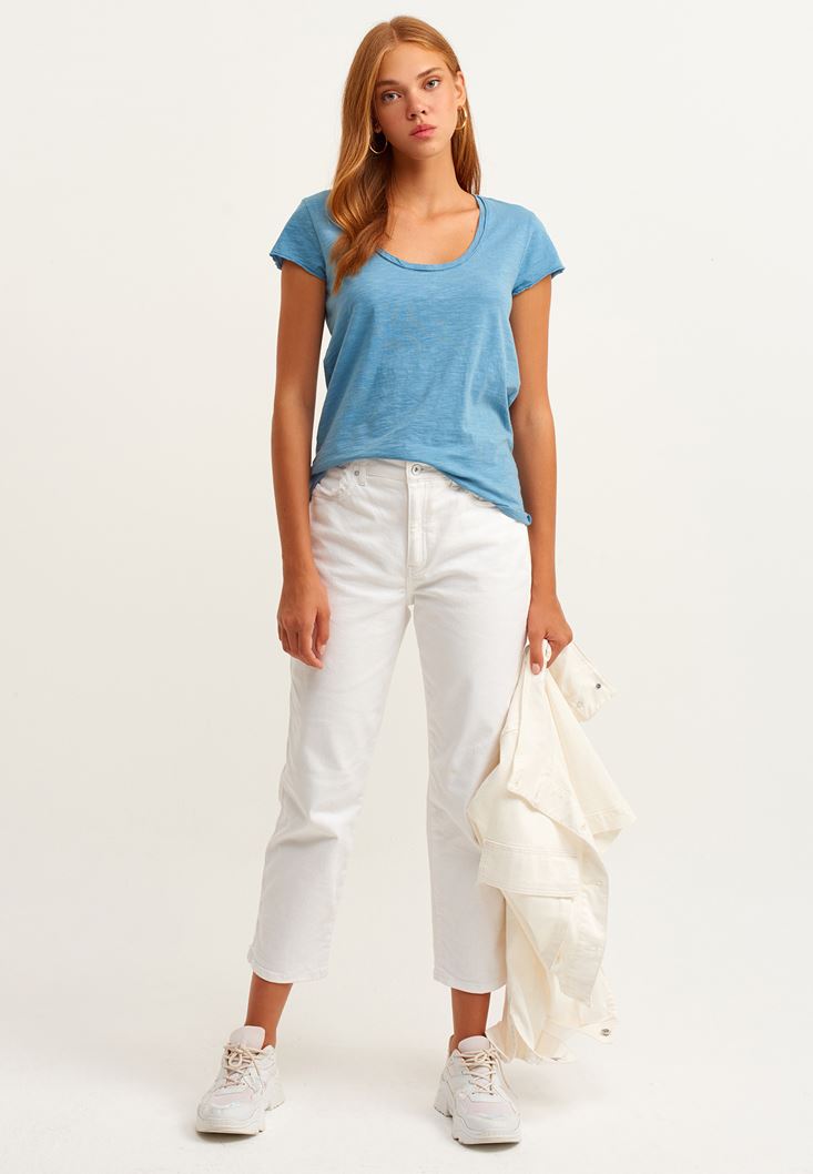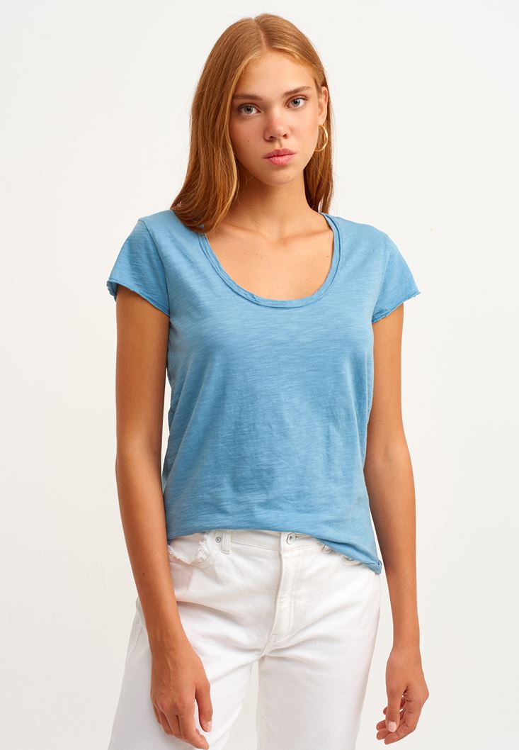 • Bayan Mavi Pamuklu U Yaka Tişört