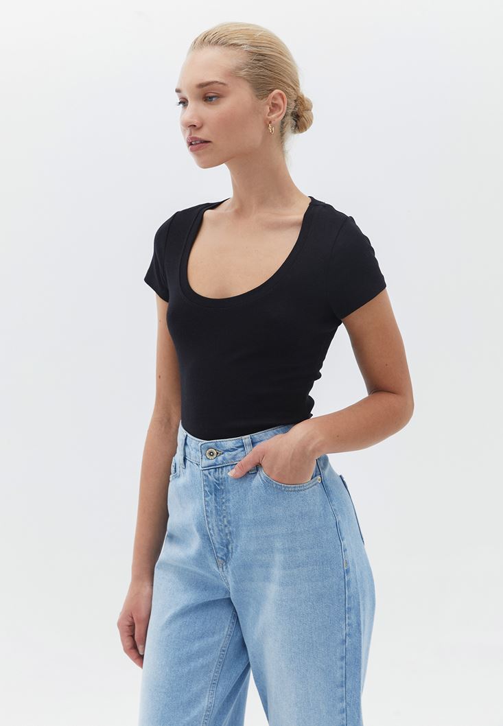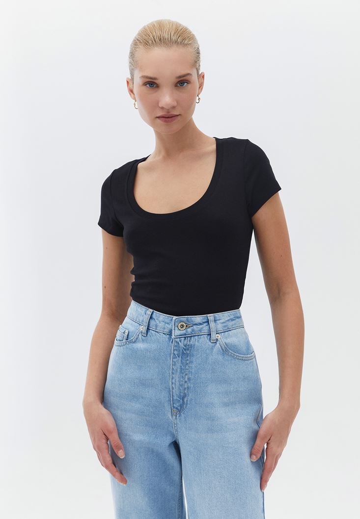 • Bayan Siyah Pamuklu U Yaka Tişört