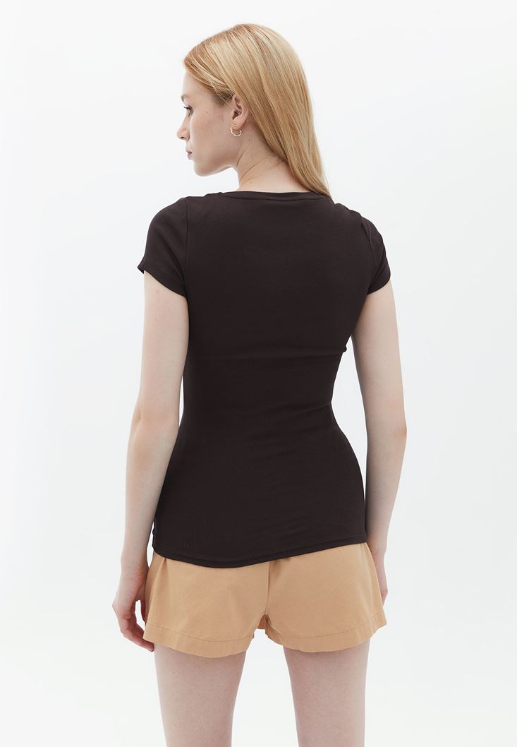 • Bayan Kahverengi Pamuklu U Yaka Tişört