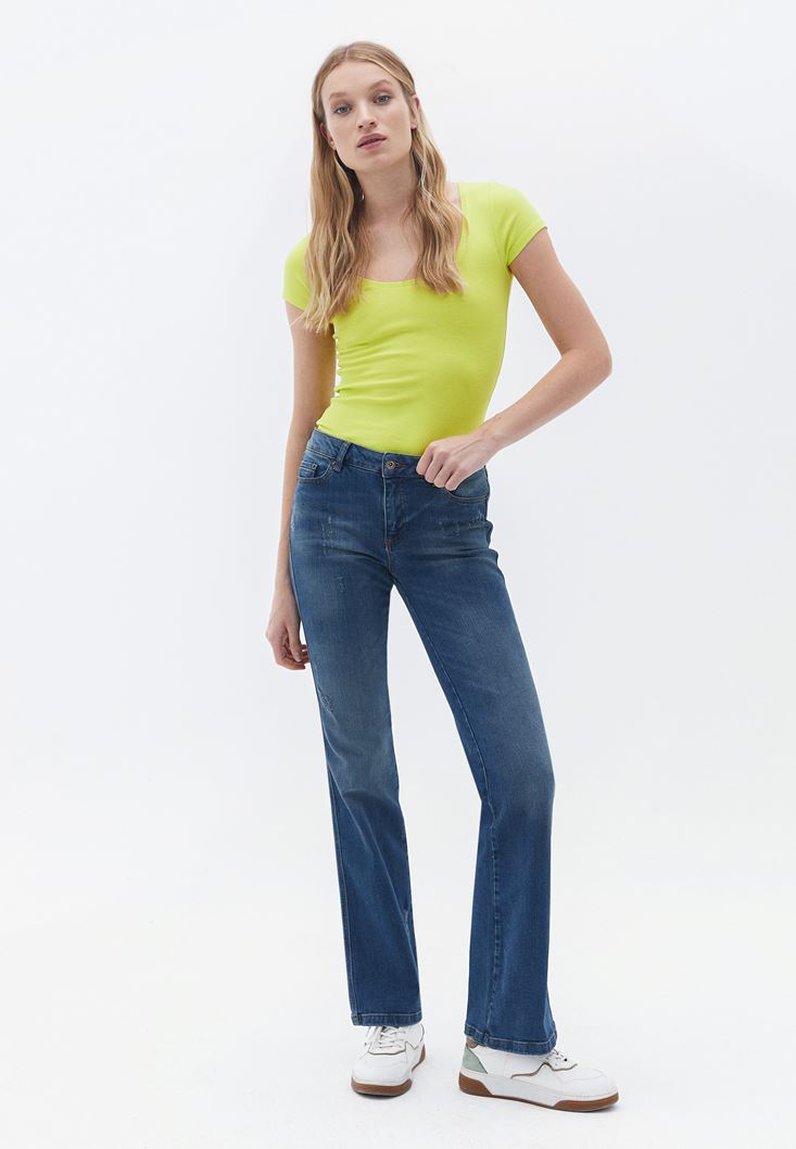 Pamuk karışımlı fitilli doku, bedeni saran esnek fit, kısa kollu, U yaka, standart boy.