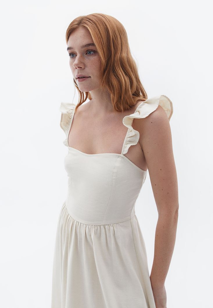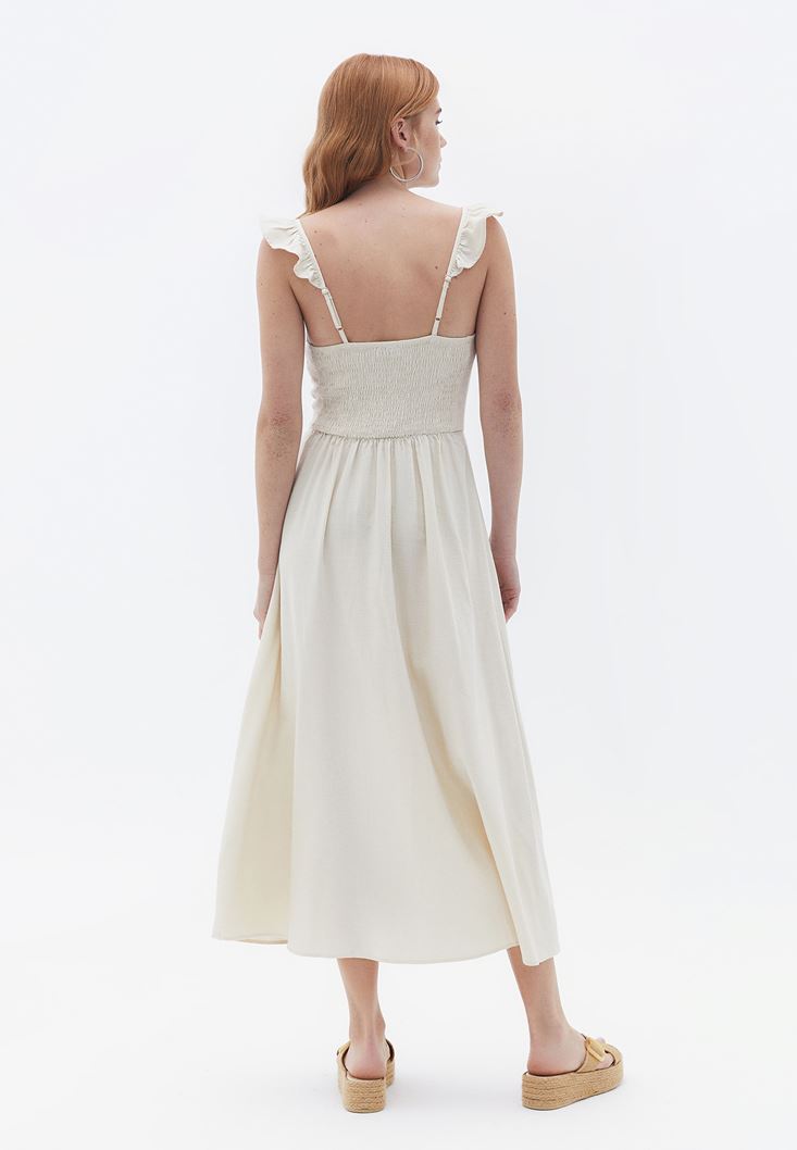 Pamuk ve viskon karışımlı doku, üst kısım bedeni saran fit, A kesim etek, fırfırlı ayarlanabilir askı, kalp yaka, uzun boy kesim, sırt kısmı esnek gipeli.