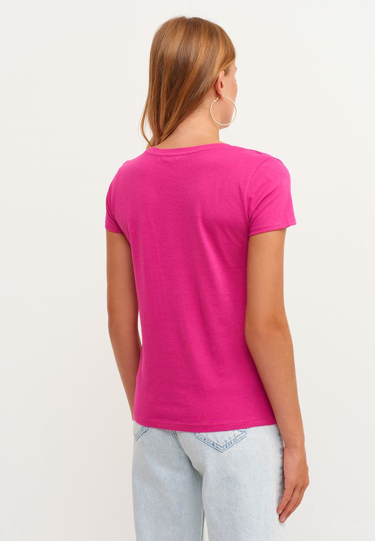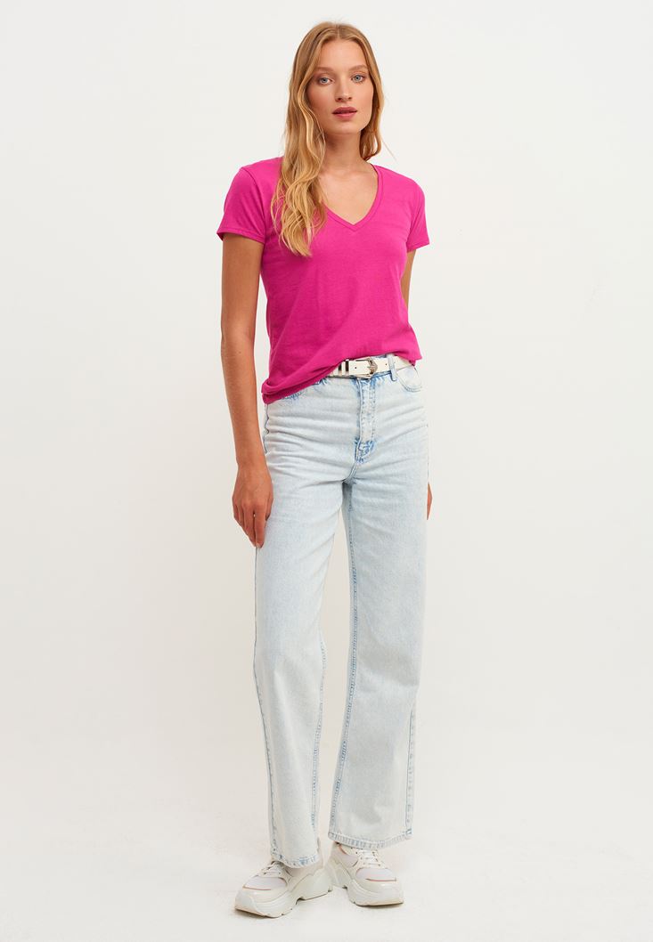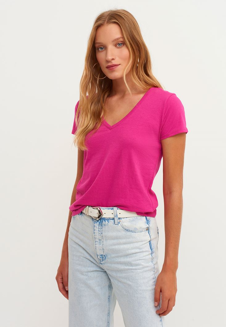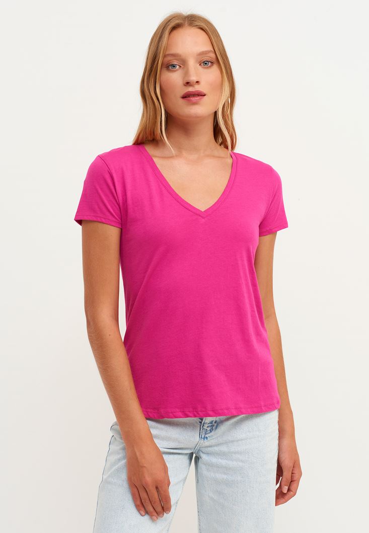 • Bayan Pembe Pamuklu V-Neck Tişört