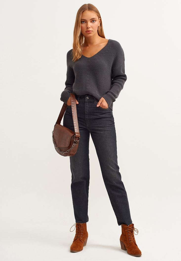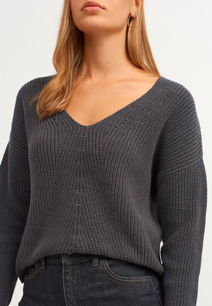 • Bayan Antrasit Pamuklu V-Neck Triko