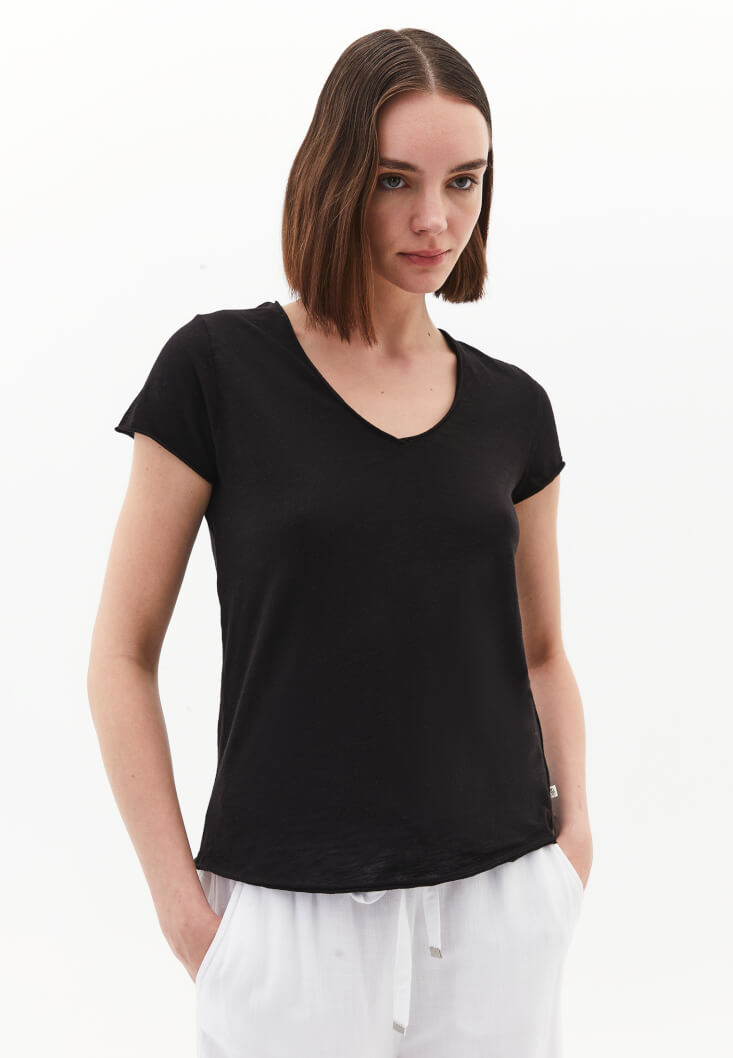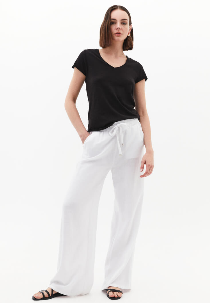 Pamuklu V Yaka Tişört ve Keten Pantolon Kombini