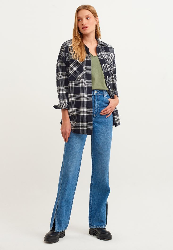 %100 pamuklu doku, V yaka kesimi, kesik detaylı kol ve etek ucu, bedenden uzak rahat form.
