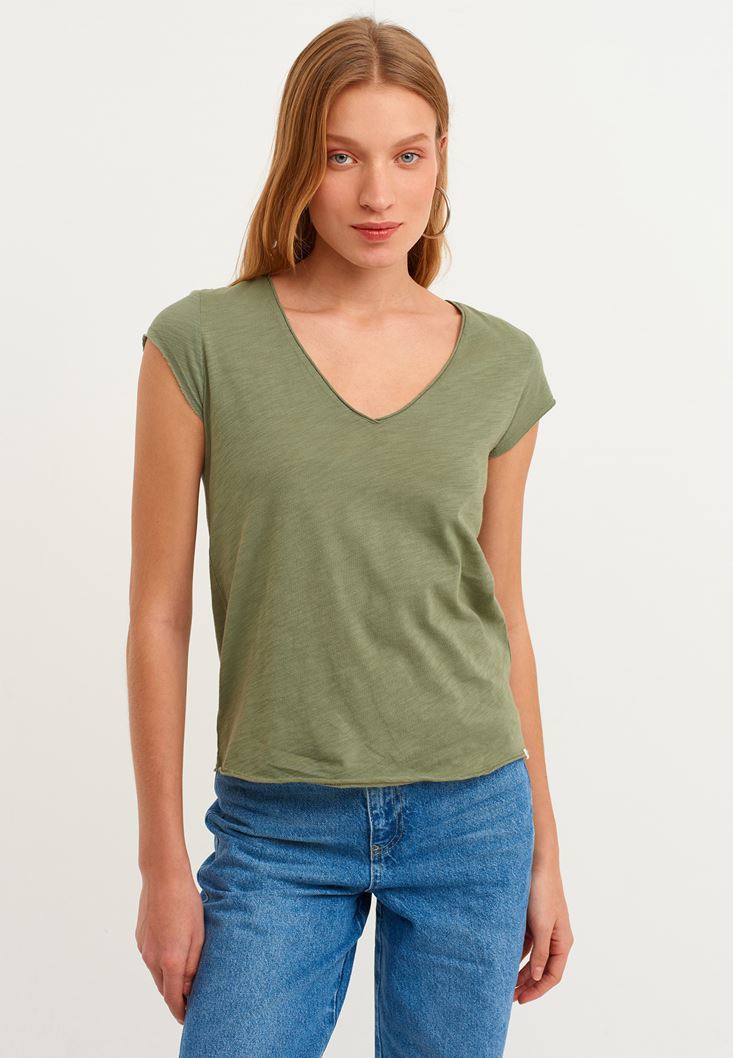 Yeşil Pamuklu V Yaka Tişört