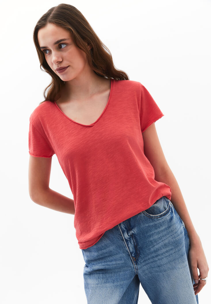 • Bayan Pembe Pamuklu V Yaka Tişört