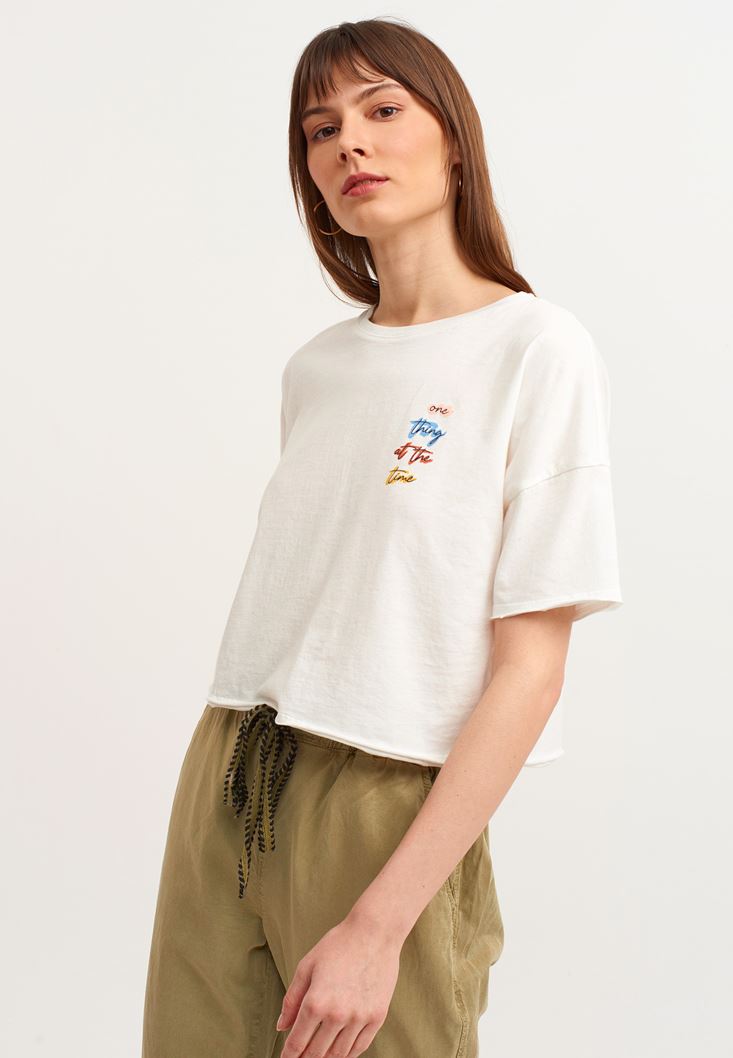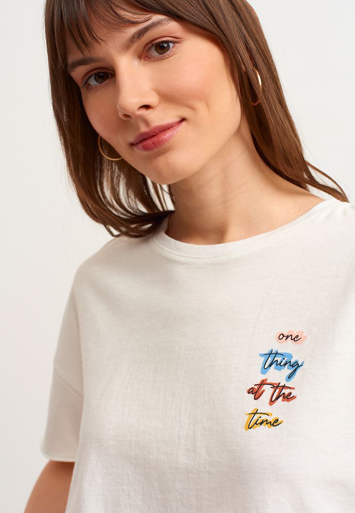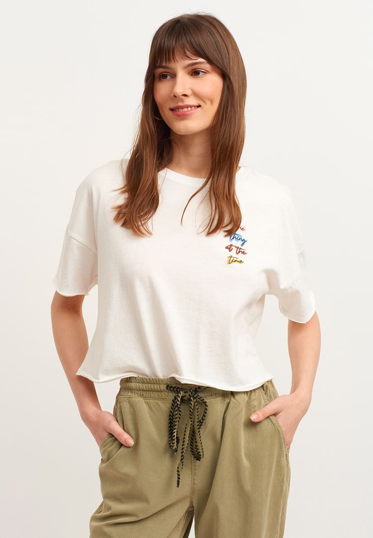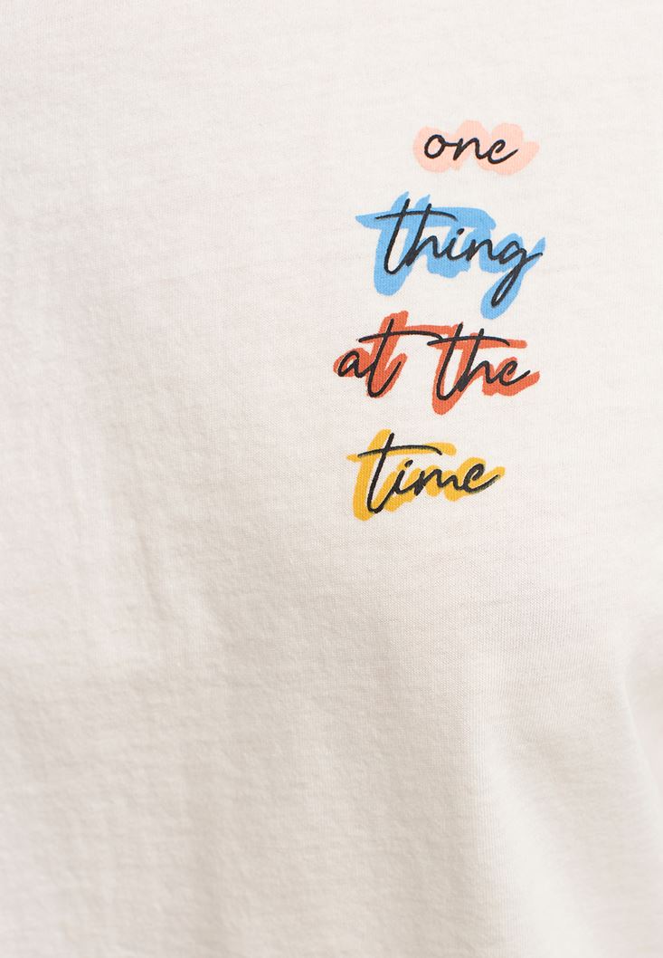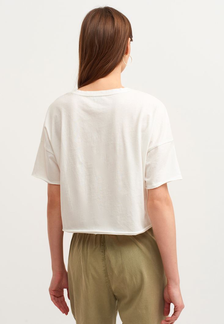 Krem Pamuklu ve Baskılı Crop Tişört