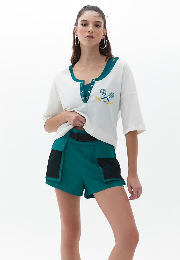 %100 pamuk içerikli doğal doku, U yaka, kısa kollu, bedenden uzak fit, yakası çıtçıt kapamalı, ön kısmı baskı detaylı.