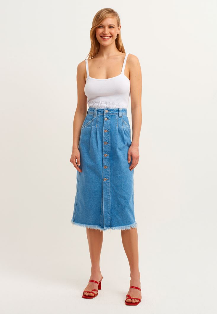 • Bayan Mavi Pamuklu ve Düğmeli Denim Midi Etek