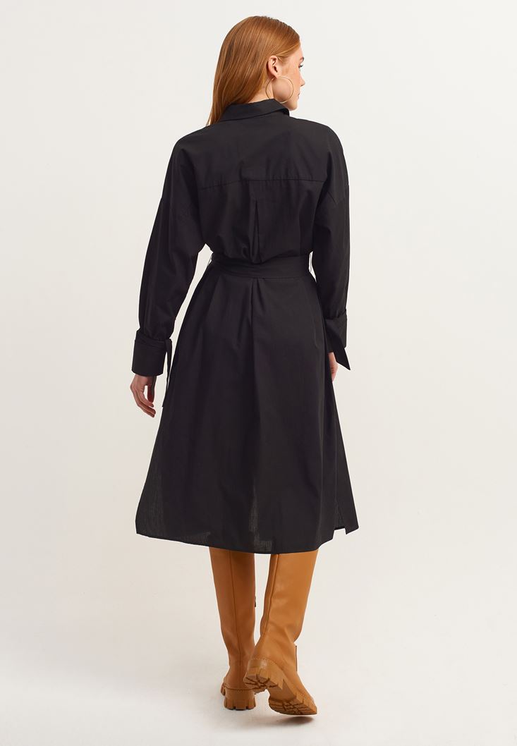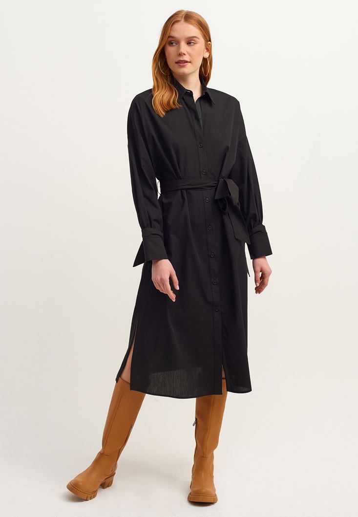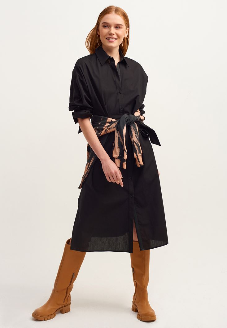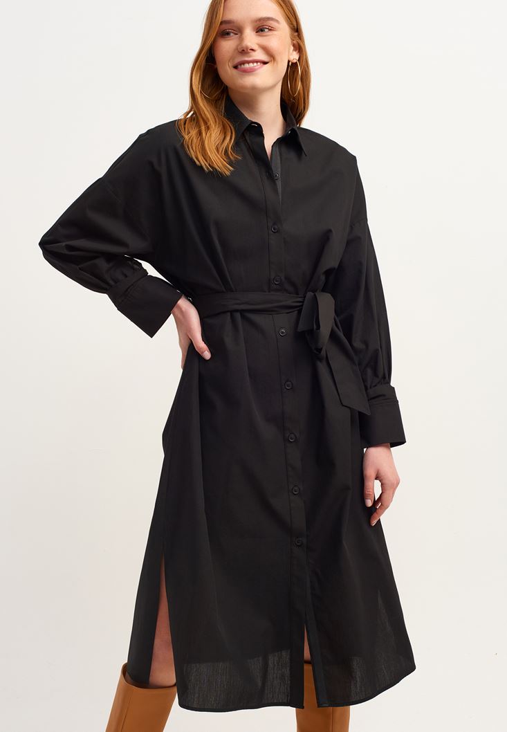 Siyah Pamuklu ve Kuşaklı Gömlek Elbise