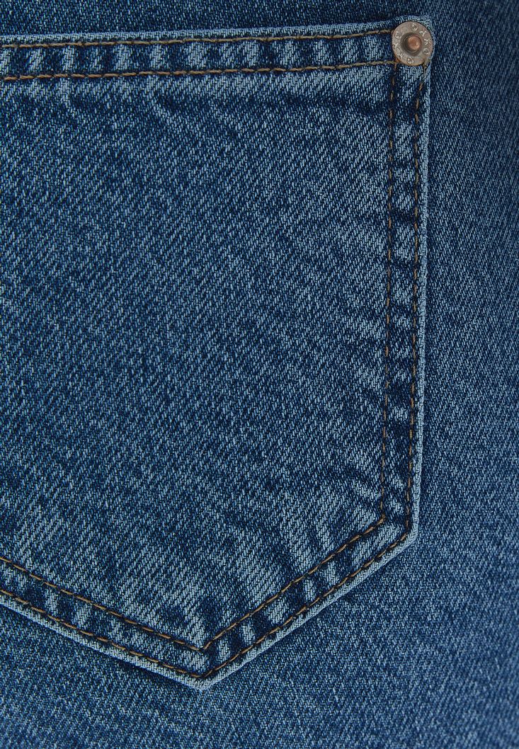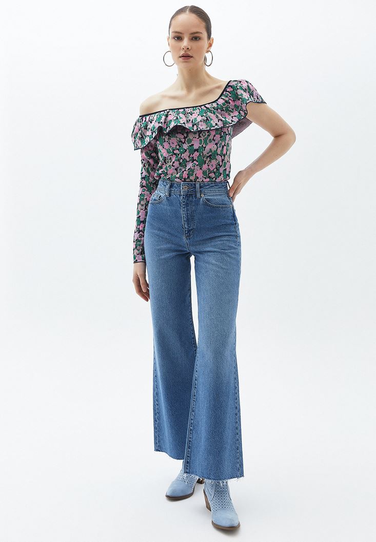 %100 pamuklu denim, ultra yüksek bel, bedenden uzak wide fit, geniş paça, önü ve arkası iki cepli.
