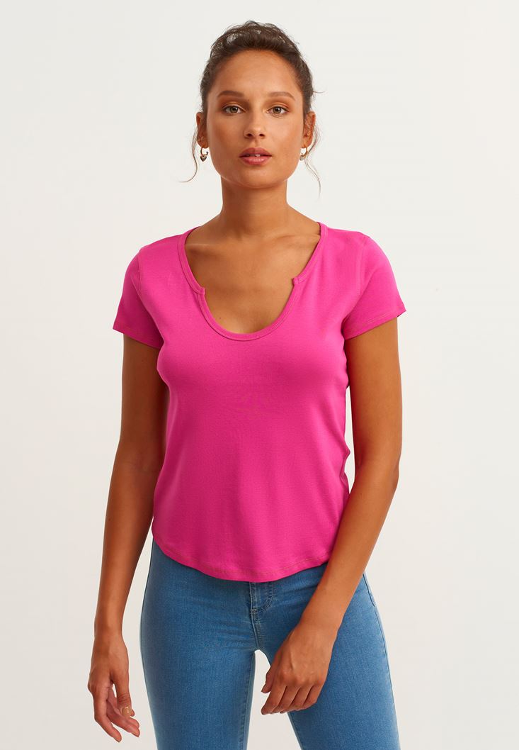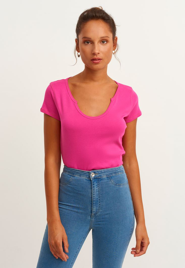 • Bayan Pembe Pamuklu Yaka Detaylı Tişört