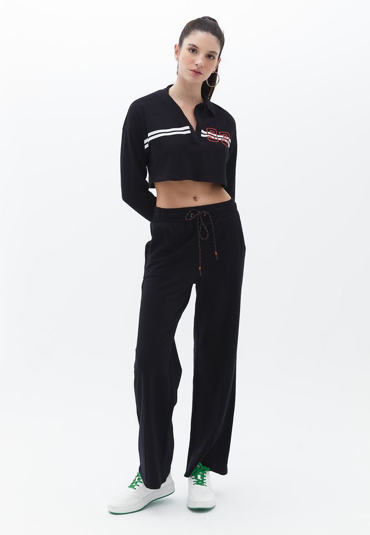Siyah Pamuklu Yüksek Bel Wide-Leg Pantolon