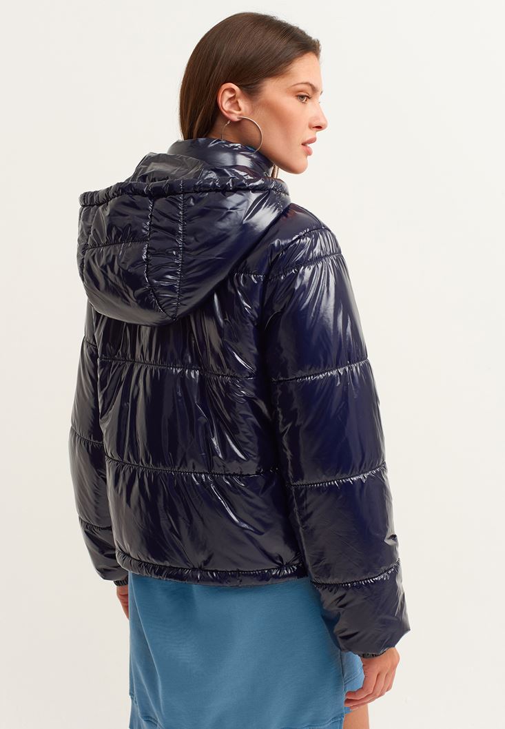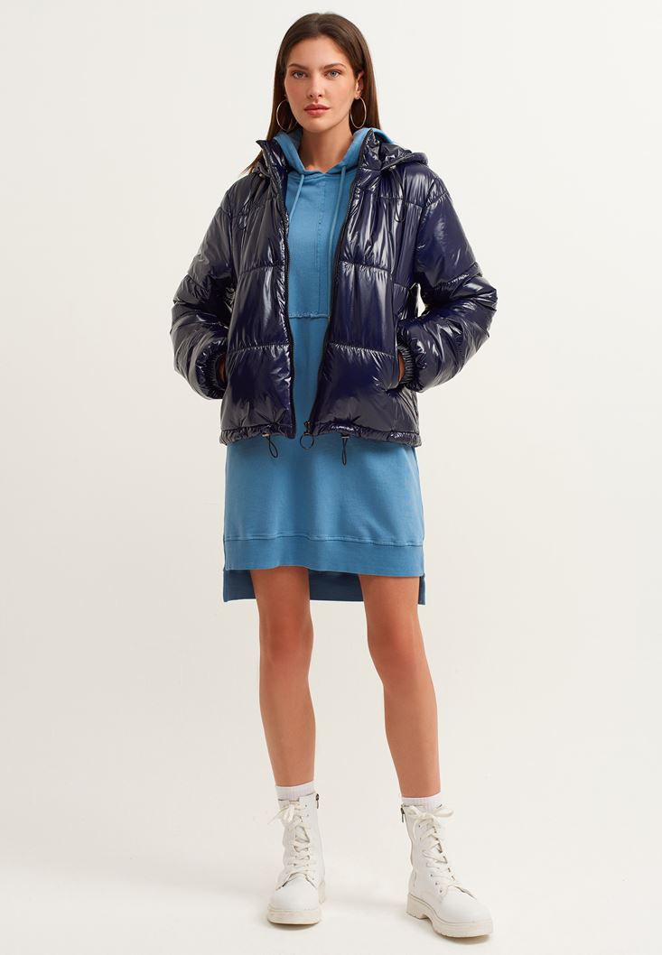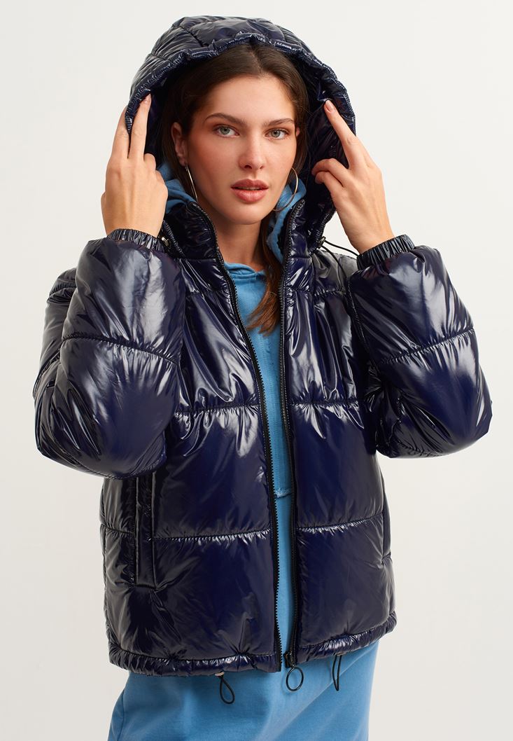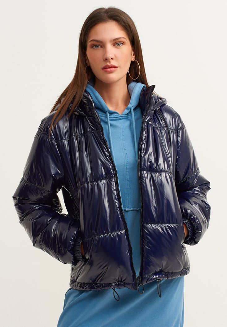 • Bayan Lacivert Parlak Dokulu ve Kapitoneli Şişme Mont