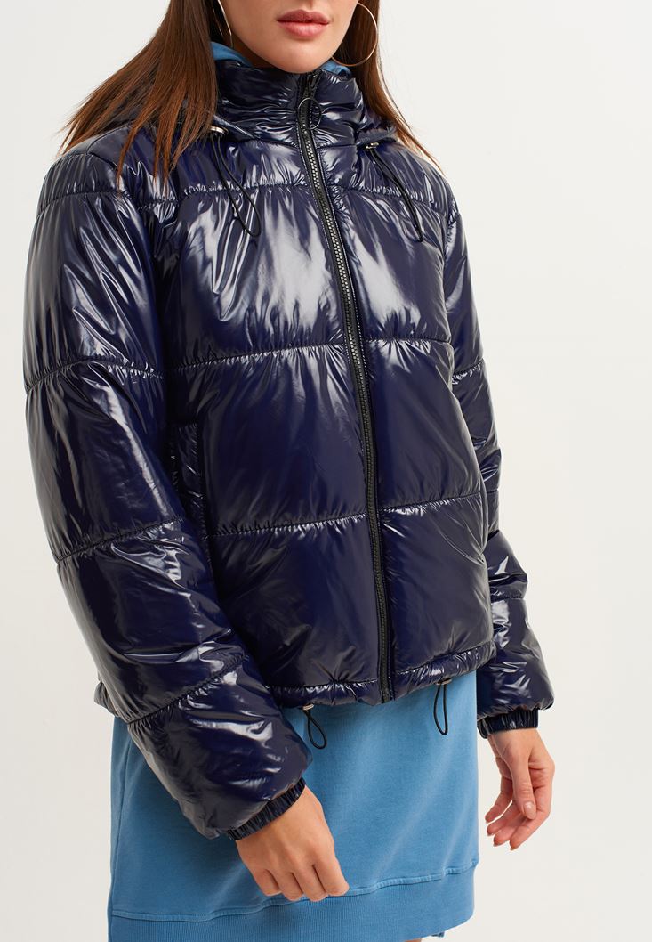 Lacivert Parlak Dokulu ve Kapitoneli Şişme Mont