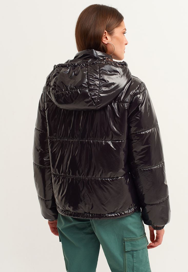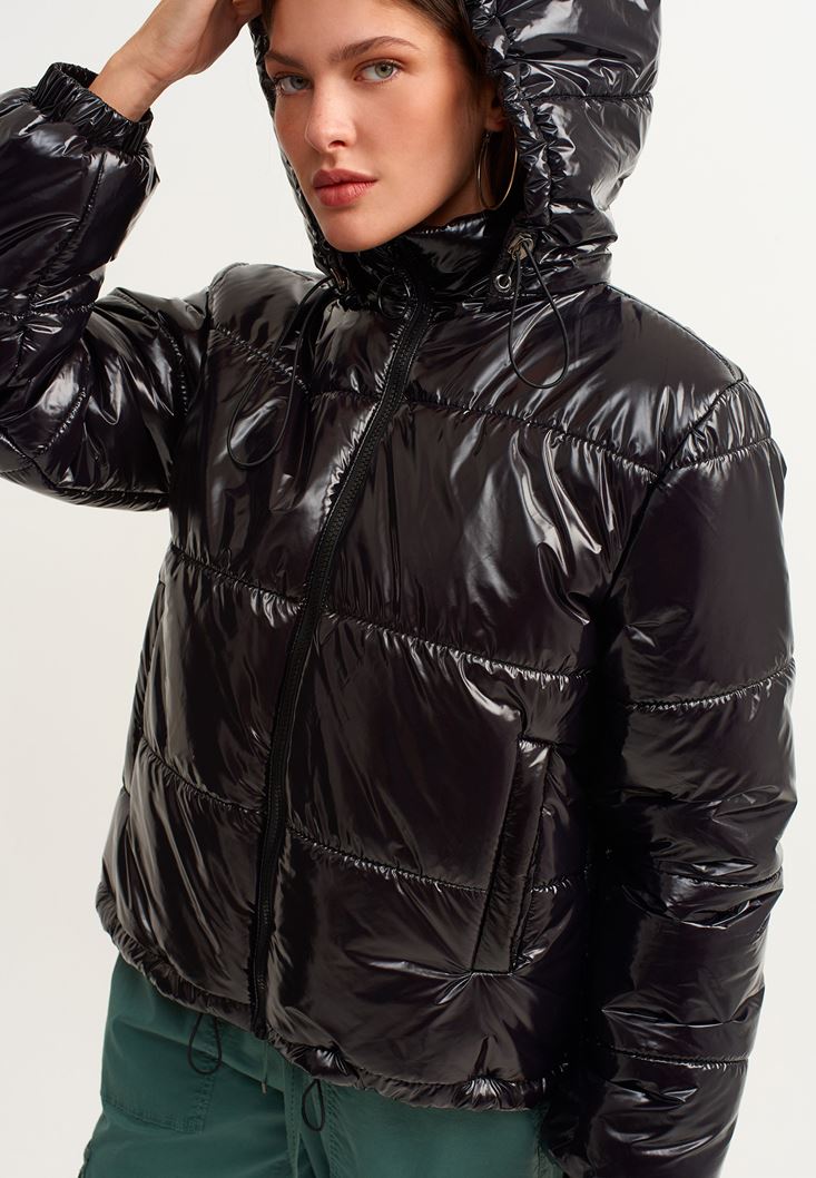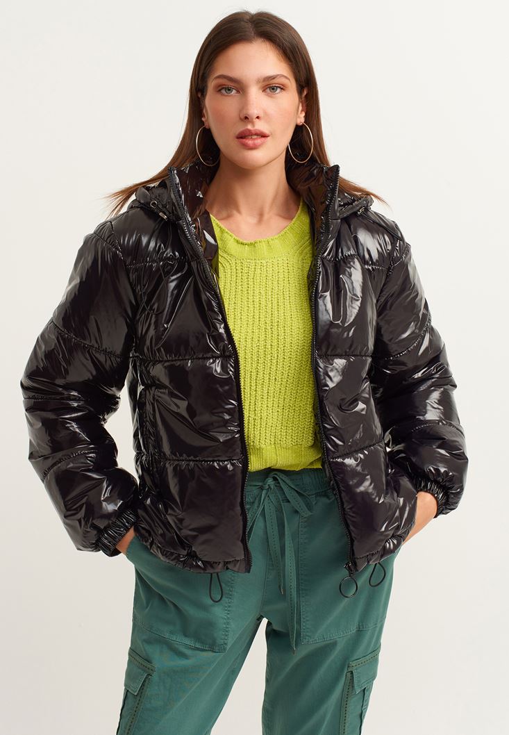 • Bayan Siyah Parlak Dokulu ve Kapitoneli Şişme Mont