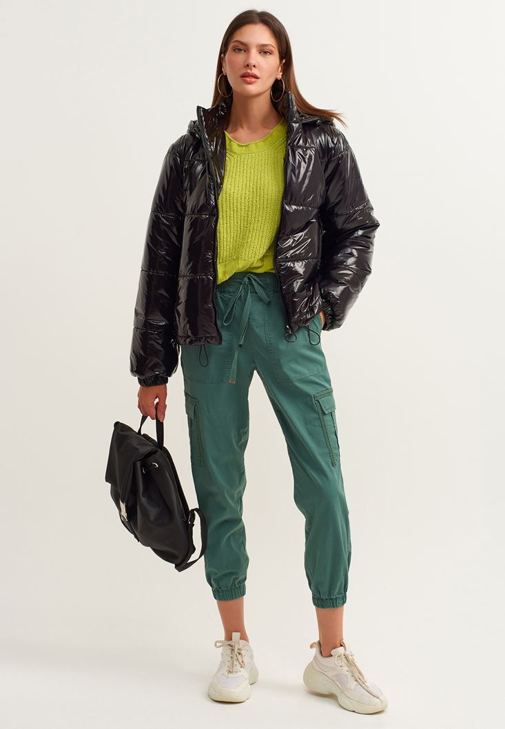 Parlak dokulu şişme doku, kapitone dikişli, ayarlanabilir kapüşonlu, önü iki cepli, beli ayarlanabilir büzgü detaylı, fermuar kapamalı.