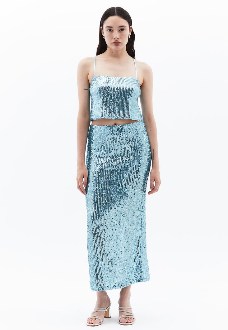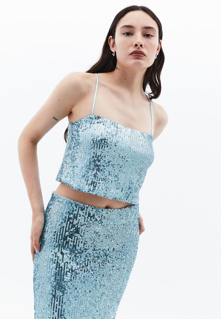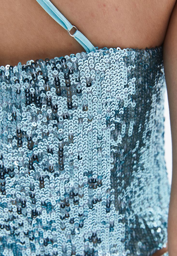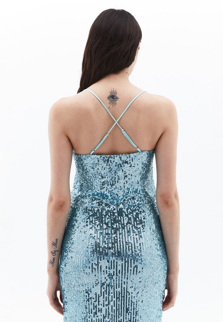 Payetli özel doku, bedenden uzak loose fit, ayarlanabilir ince askılı, straplez yaka, crop kesim, sırt kısmı çapraz askılı.