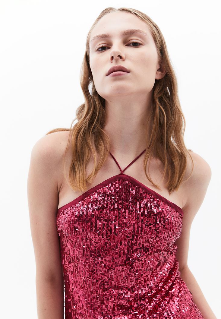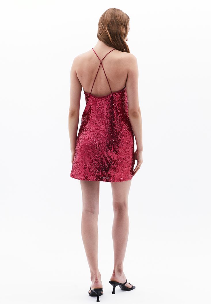 Saten dokulu payetli tasarım, bedenden uzak loose fit, halter yaka, mini boy, sırt kısmı çapraz askılı.