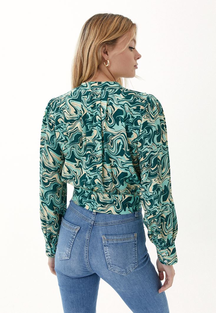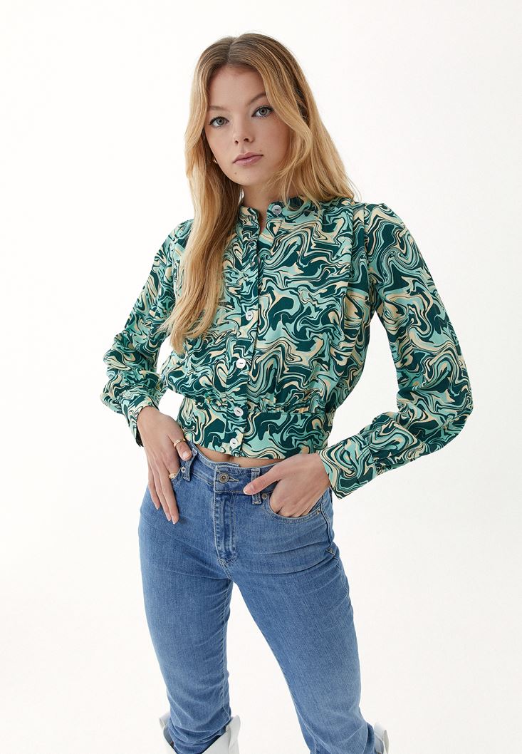 %100 viskon içerikli doku, mix desenli, crop kesim, bedeni pile detaylı, yüksek yaka, beli saran form, uzun kollu.