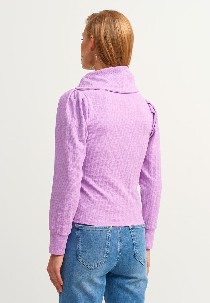 Pamuk karışımlı özel doku, katlamalı kruvaze yaka, hacimli ve pileli balon kol duruşu.
