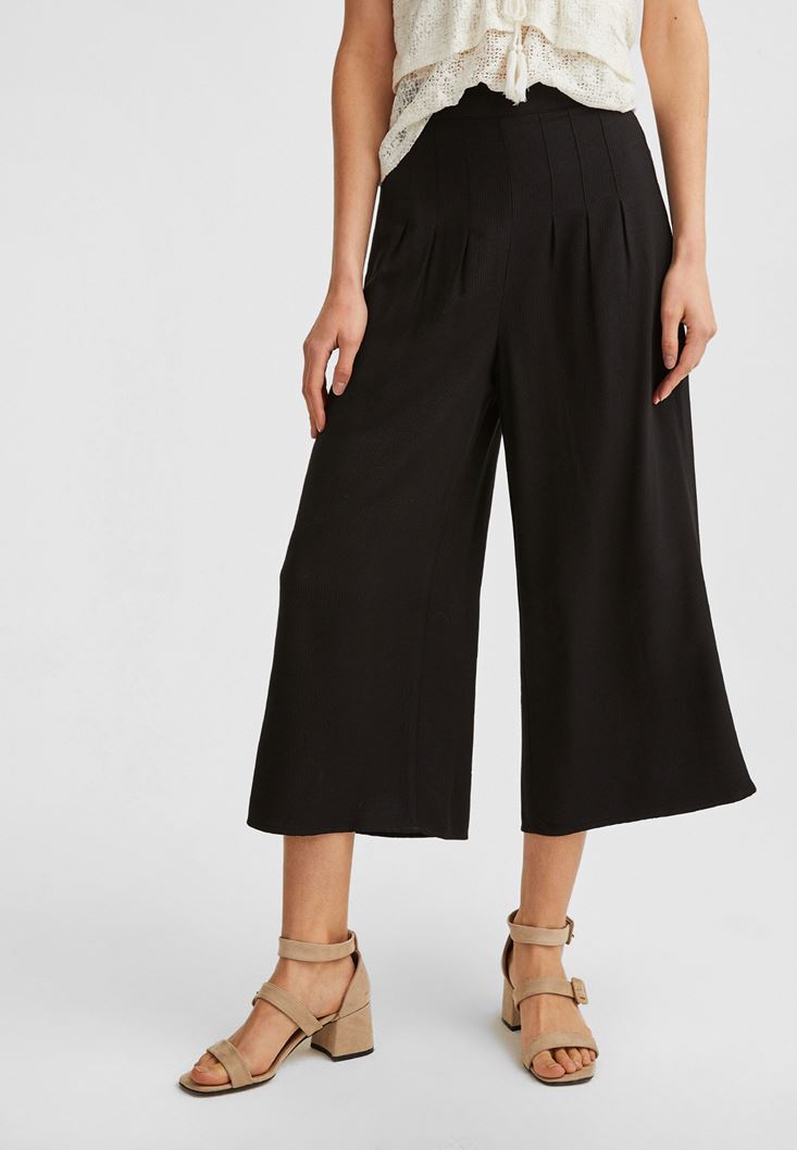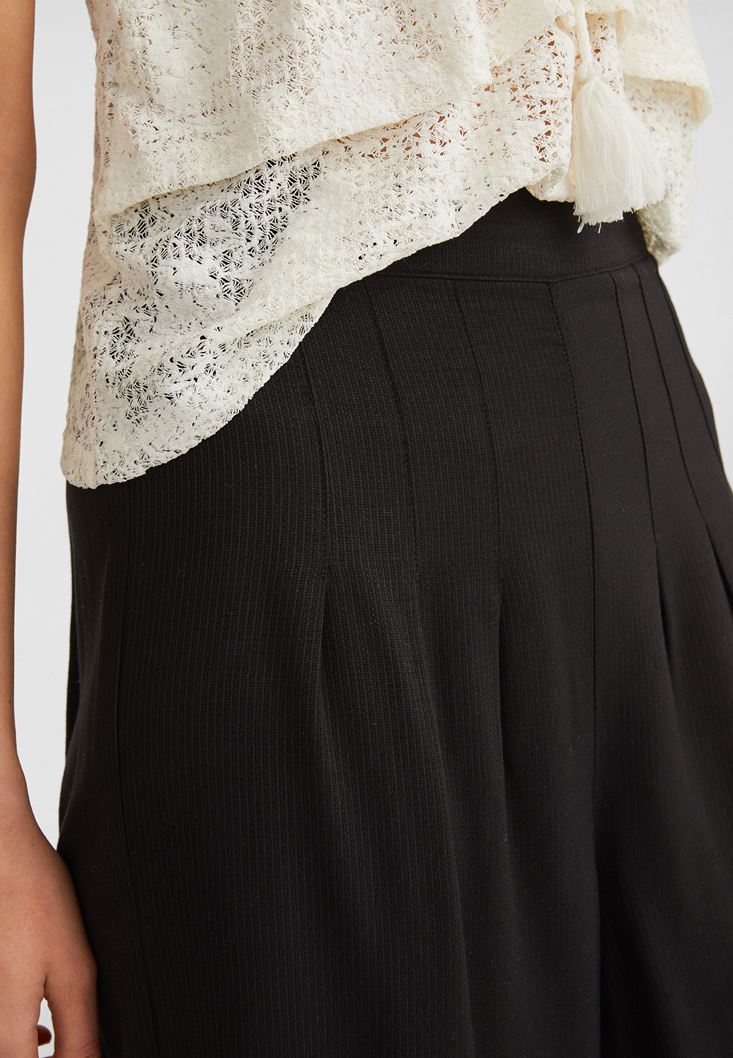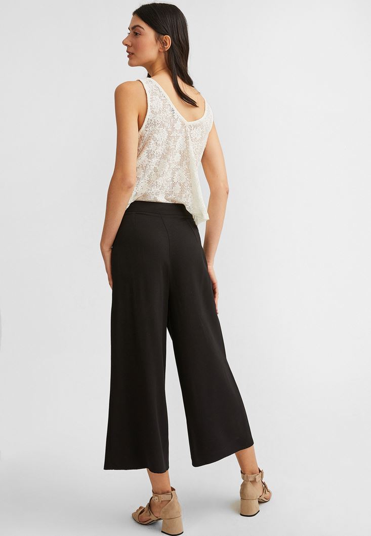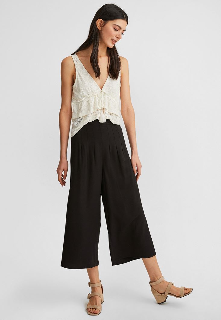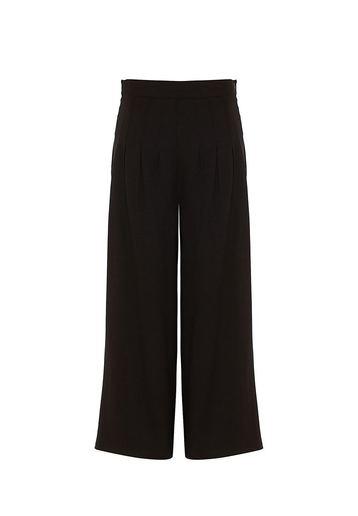 Pileli Bol Pantolon sadeliği ve şıklığı başarılı bir şekilde bir araya getirirken aynı zamanda OXXO’nun dokulardan aldığı ilhamı da yansıtan parçalardan birisi. Yüksek bel kesimi ve bu kesimi ön plana çıkaran kalın biye detayı ile konforlu bir kullanım deneyimi sunan pantolon modeli belden itibaren kullanılan pens detayları ile hoş bir görünüm sunuyor. Kısa paça boyu ve dökümlü duruşu ile hareketli bir görünüme sahip olan pantolon modelinin dokusunda yer alan viskon lifi tasarımın konforunu ön plana çıkarıyor. Viskon lifinin nefes alan yapısı sayesinde uzun süreli kullanımda bile dikkat çekici bir kullanım deneyimi ve hareket özgürlüğü sunan pantolon modeli kısa sürede favori parçalarınızdan birisi olacak.