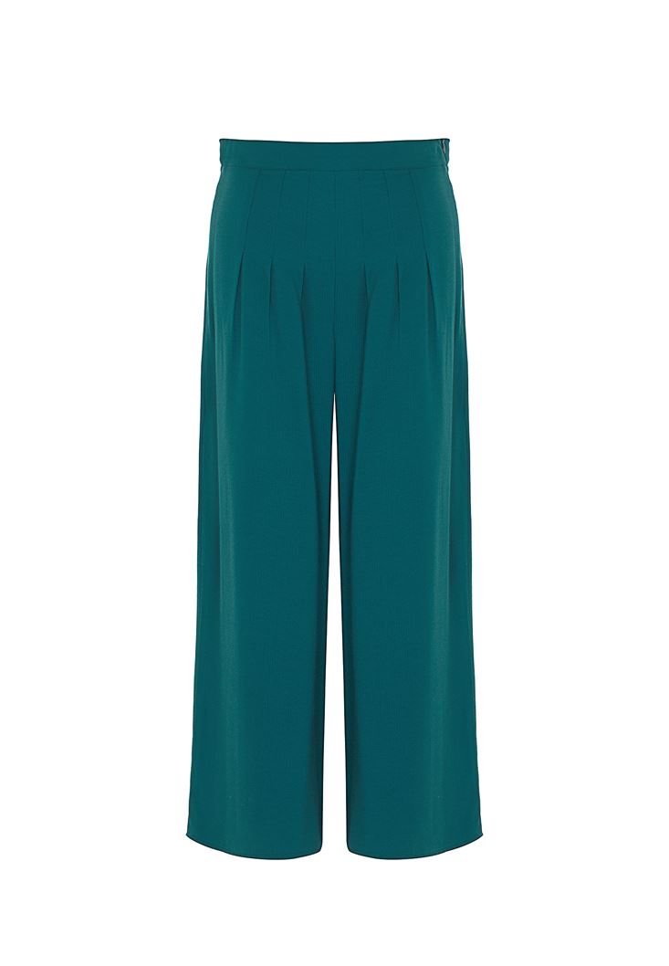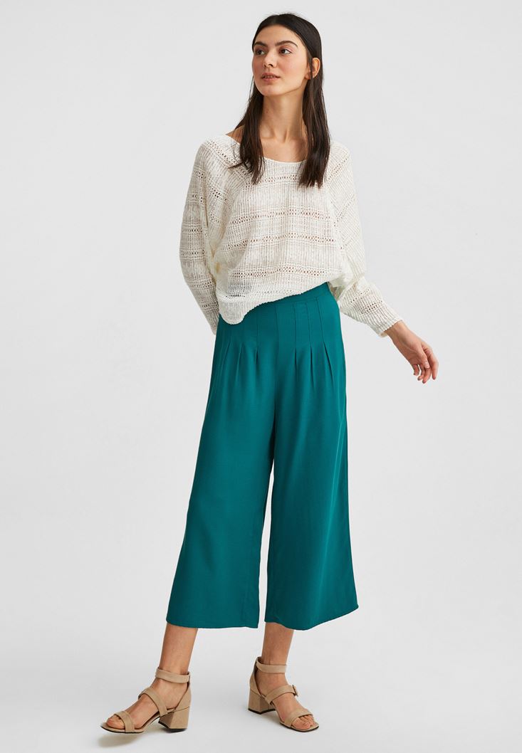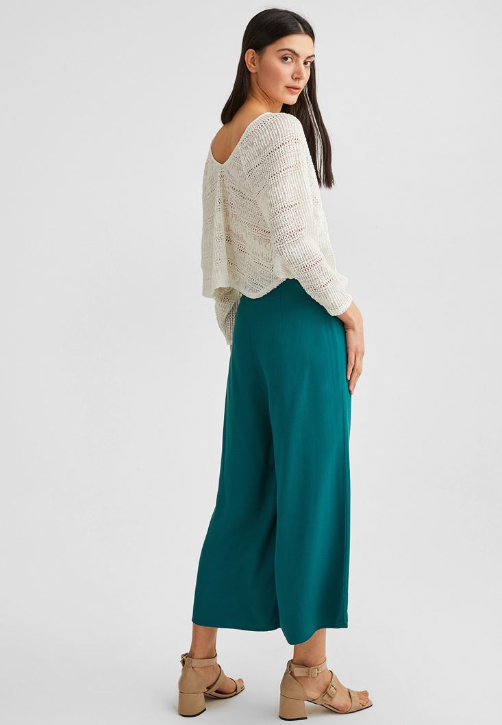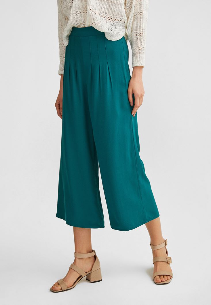 Pileli Bol Pantolon sadeliği ve şıklığı başarılı bir şekilde bir araya getirirken aynı zamanda OXXO’nun dokulardan aldığı ilhamı da yansıtan parçalardan birisi. Yüksek bel kesimi ve bu kesimi ön plana çıkaran kalın biye detayı ile konforlu bir kullanım deneyimi sunan pantolon modeli belden itibaren kullanılan pens detayları ile hoş bir görünüm sunuyor. Kısa paça boyu ve dökümlü duruşu ile hareketli bir görünüme sahip olan pantolon modelinin dokusunda yer alan viskon lifi tasarımın konforunu ön plana çıkarıyor. Viskon lifinin nefes alan yapısı sayesinde uzun süreli kullanımda bile dikkat çekici bir kullanım deneyimi ve hareket özgürlüğü sunan pantolon modeli kısa sürede favori parçalarınızdan birisi olacak.