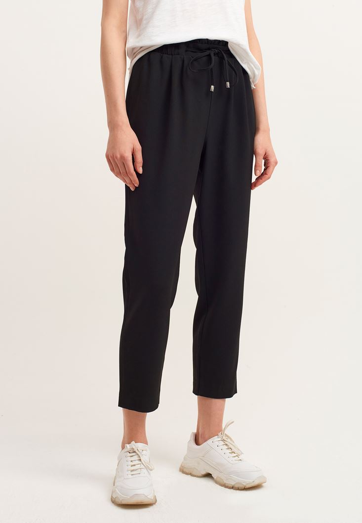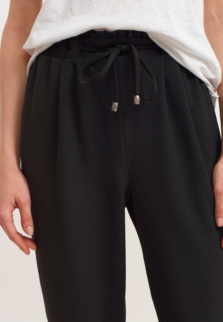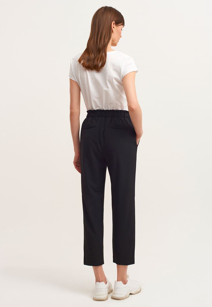 Viskon karışımlı doku, carrot-fit kalıp, büzgülü ve bağcıklı bel, bilekte biten paça boyu, yüksek bel.