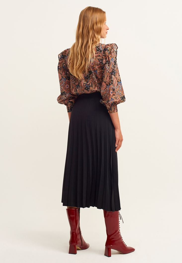 A-line kesim, pileli tasarım, yüksek bel, yan kısmı gizli fermuarlı, midi boy, bedenden uzak rahat form.