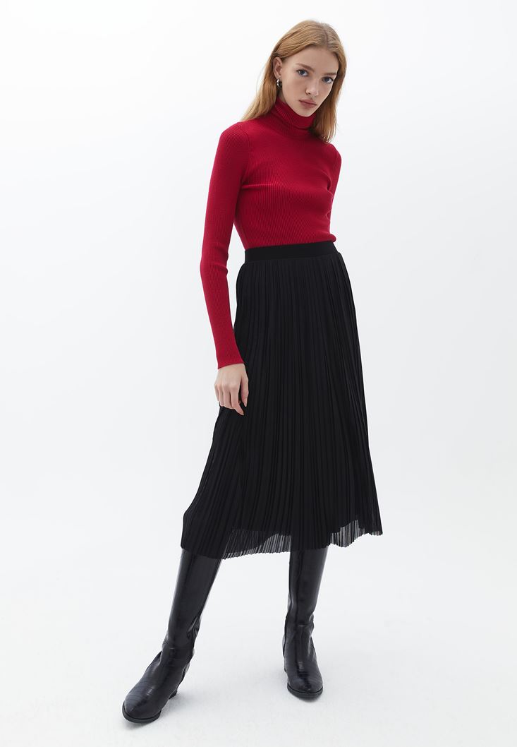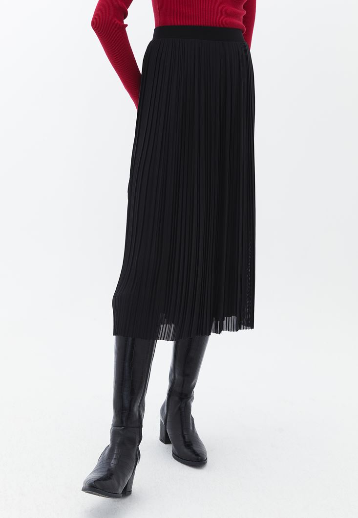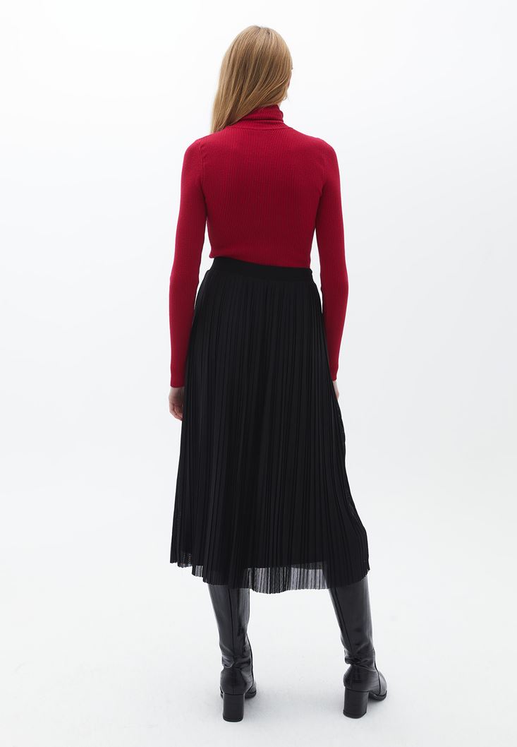Pileli özel doku, yüksek bel, beli lastikli, midi boy, içi astarlı, a kesim.