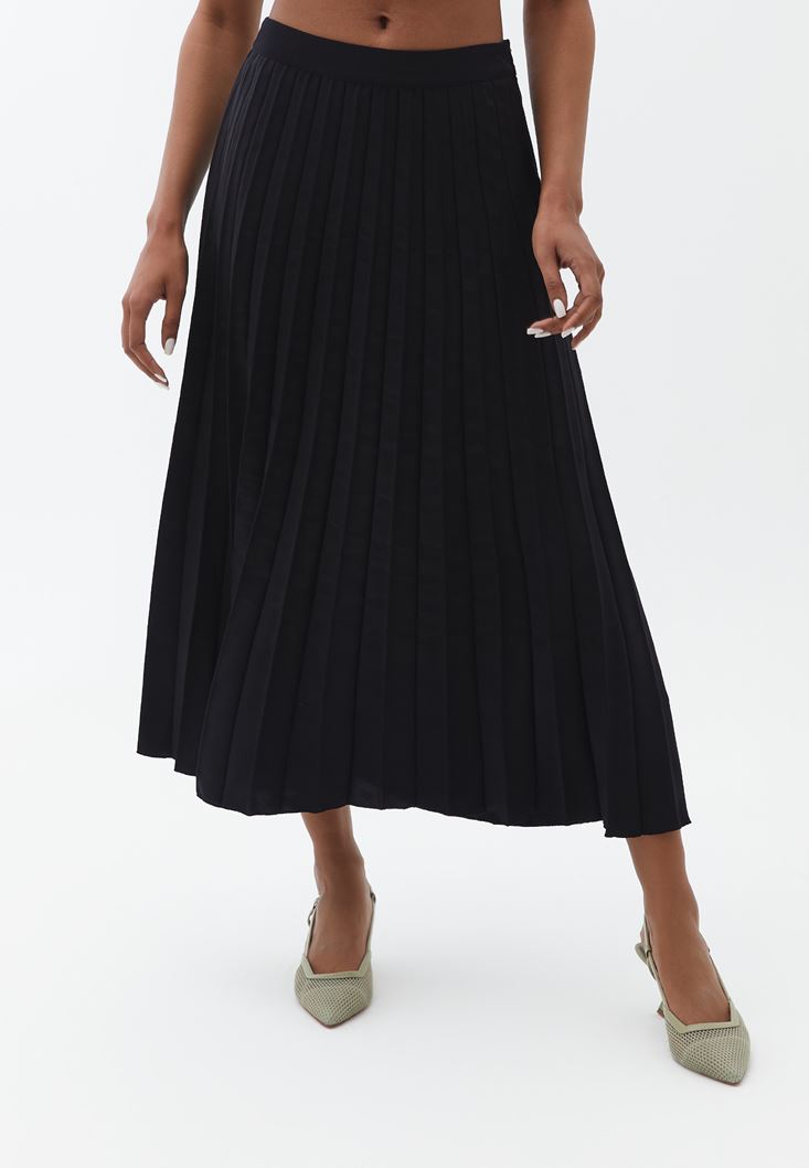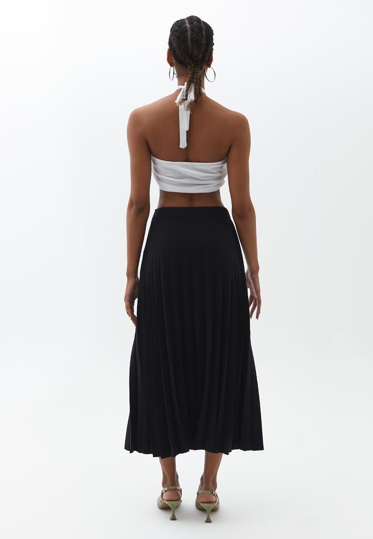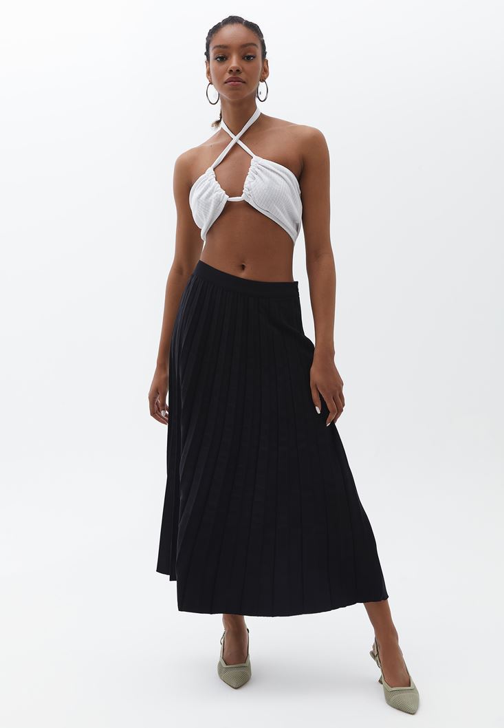 A kesim, özel pileli doku, beli gizli fermuarlı, yüksek bel, midi boy, bedenden uzak rahat fit.