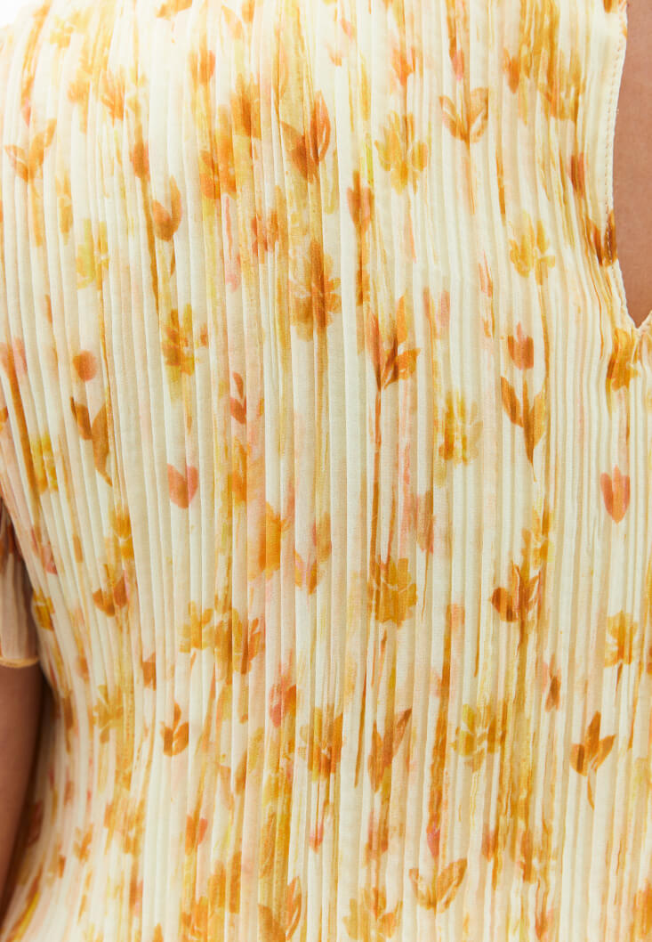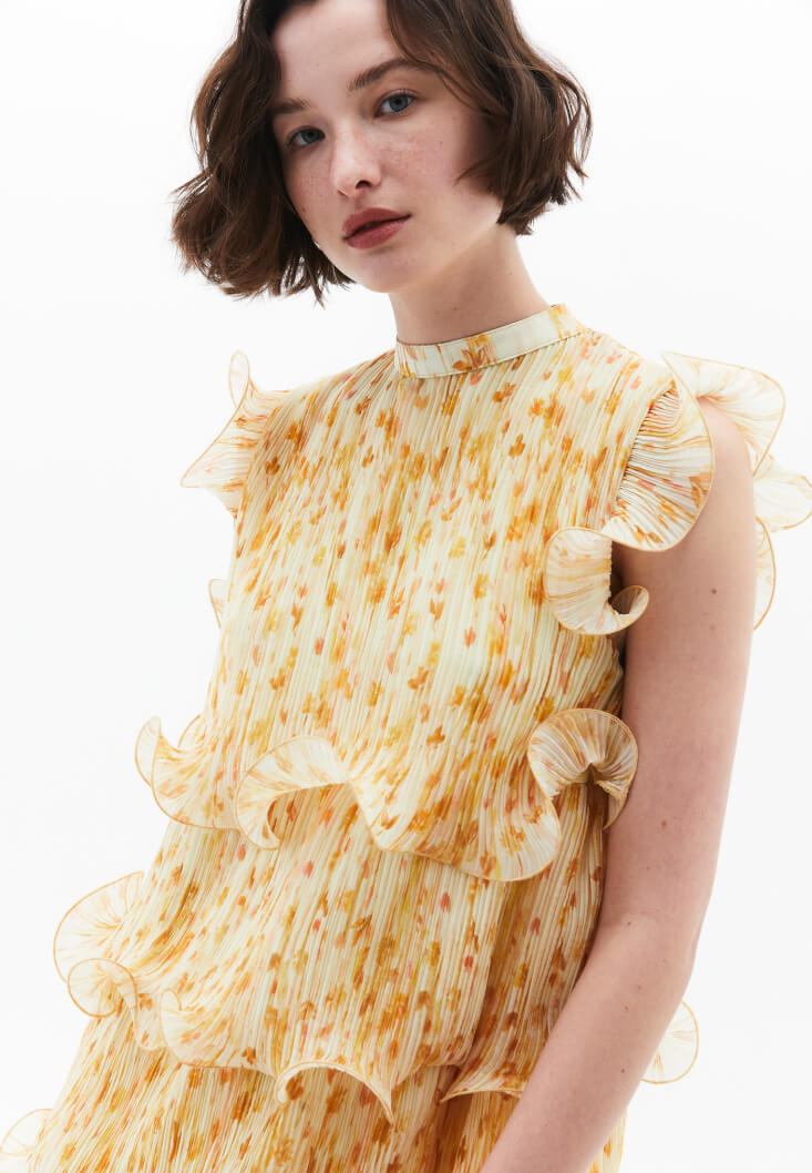 Desenli ve piliseli doku, bedenden uzak loose fit, kolsuz tasarım, katlı ve volanlı görünüm, yüksek yaka, omuz kısımları katlı ve volanlı, mini boy, içi astarlı.