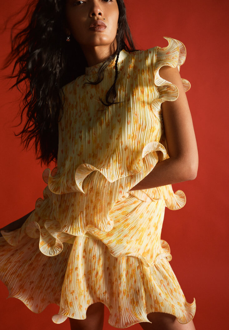 Canlı desenleri ve hareketli formuyla öne çıkan bu mini elbise, pile detaylarıyla dinamik bir siluet sunarken modern çizgisiyle dikkat çeker. Mini elbise modeli; loose fit kesimiyle feminen ve dengeli bir görünüm yaratır.