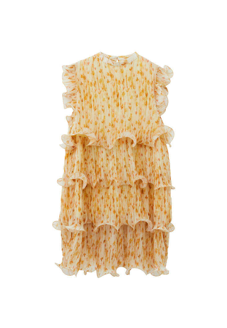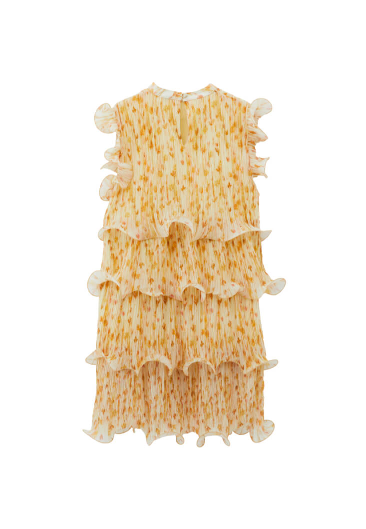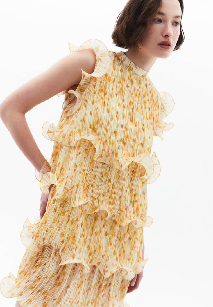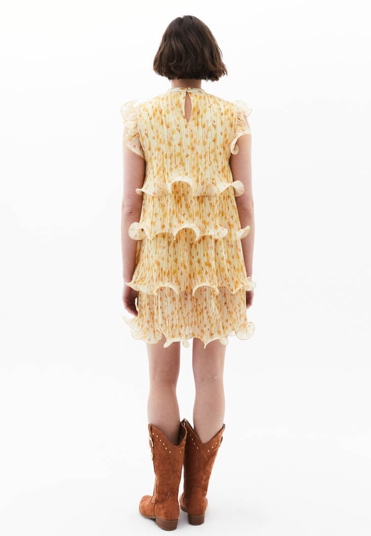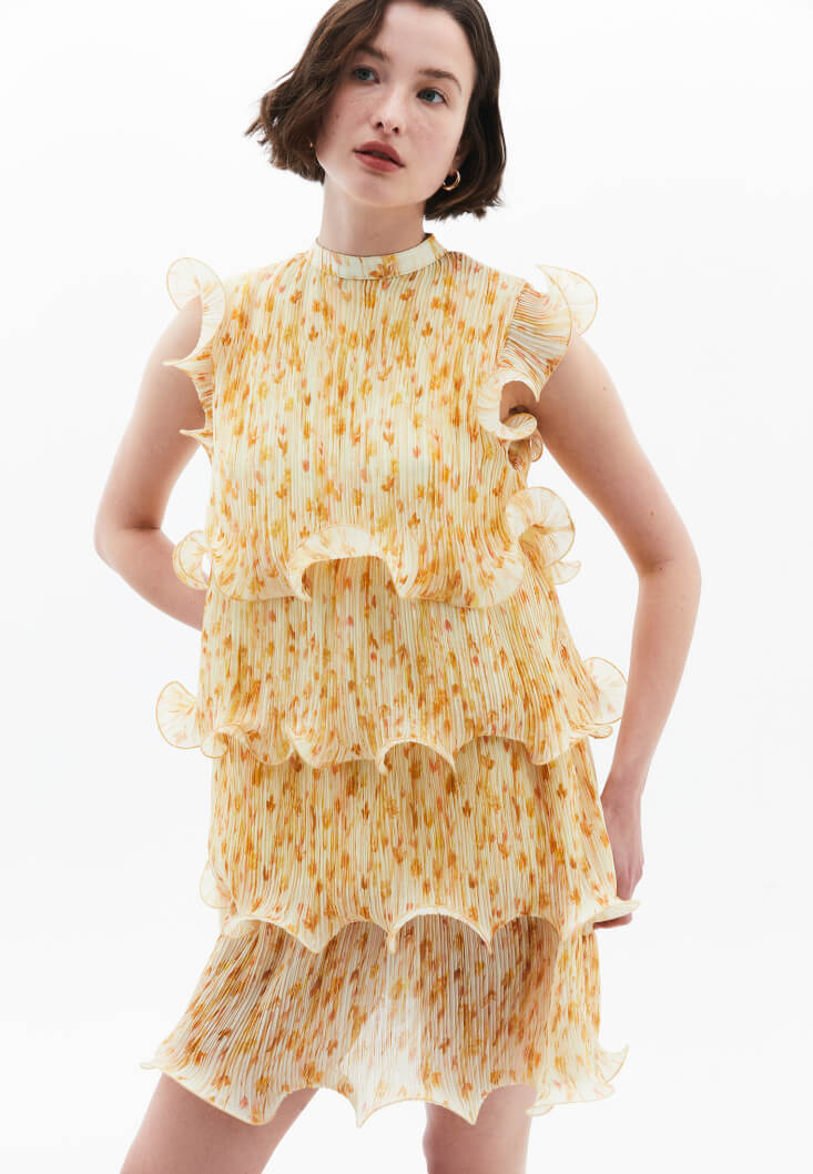 Desenli ve piliseli doku, bedenden uzak loose fit, kolsuz tasarım, katlı ve volanlı görünüm, yüksek yaka, omuz kısımları katlı ve volanlı, mini boy, içi astarlı.