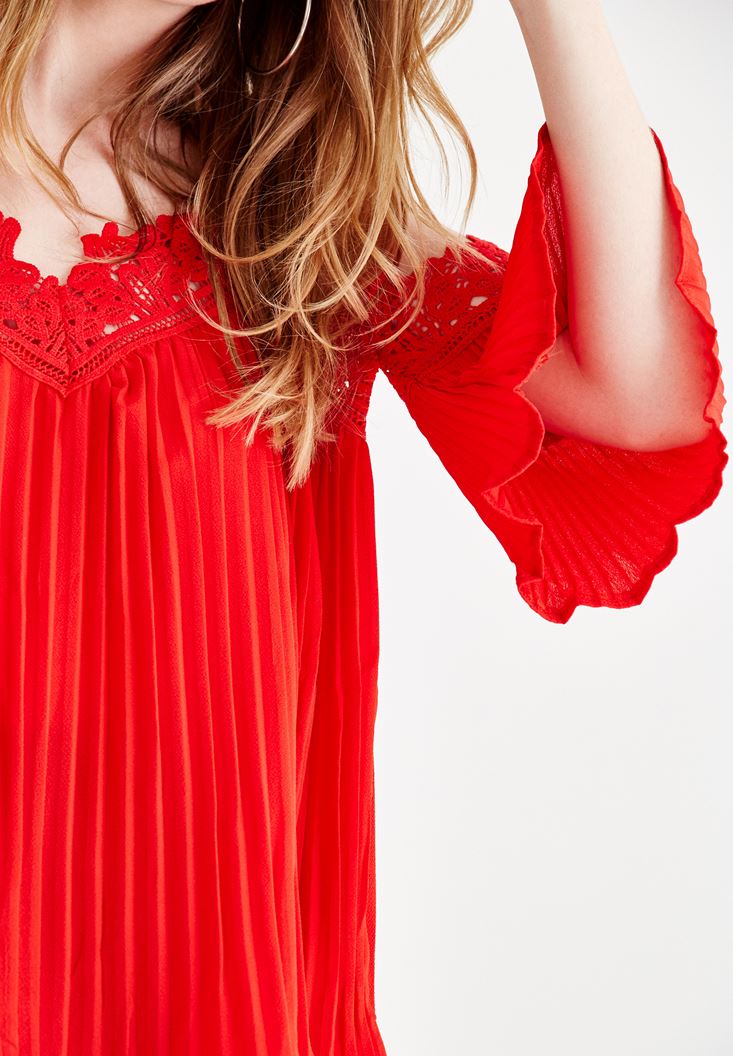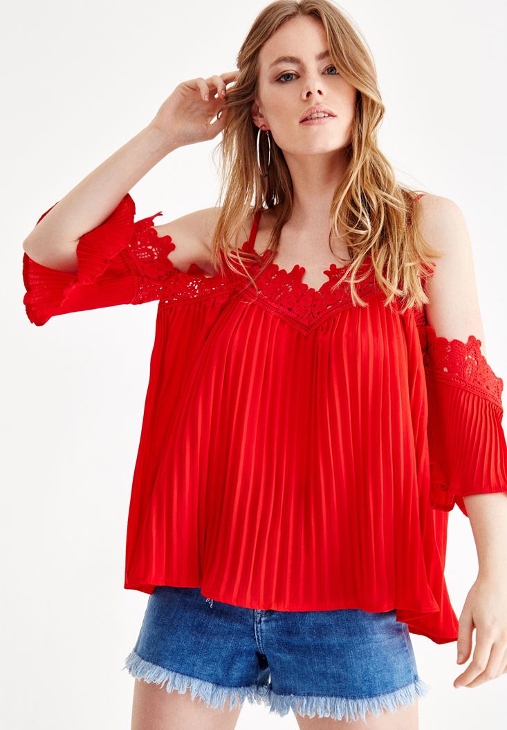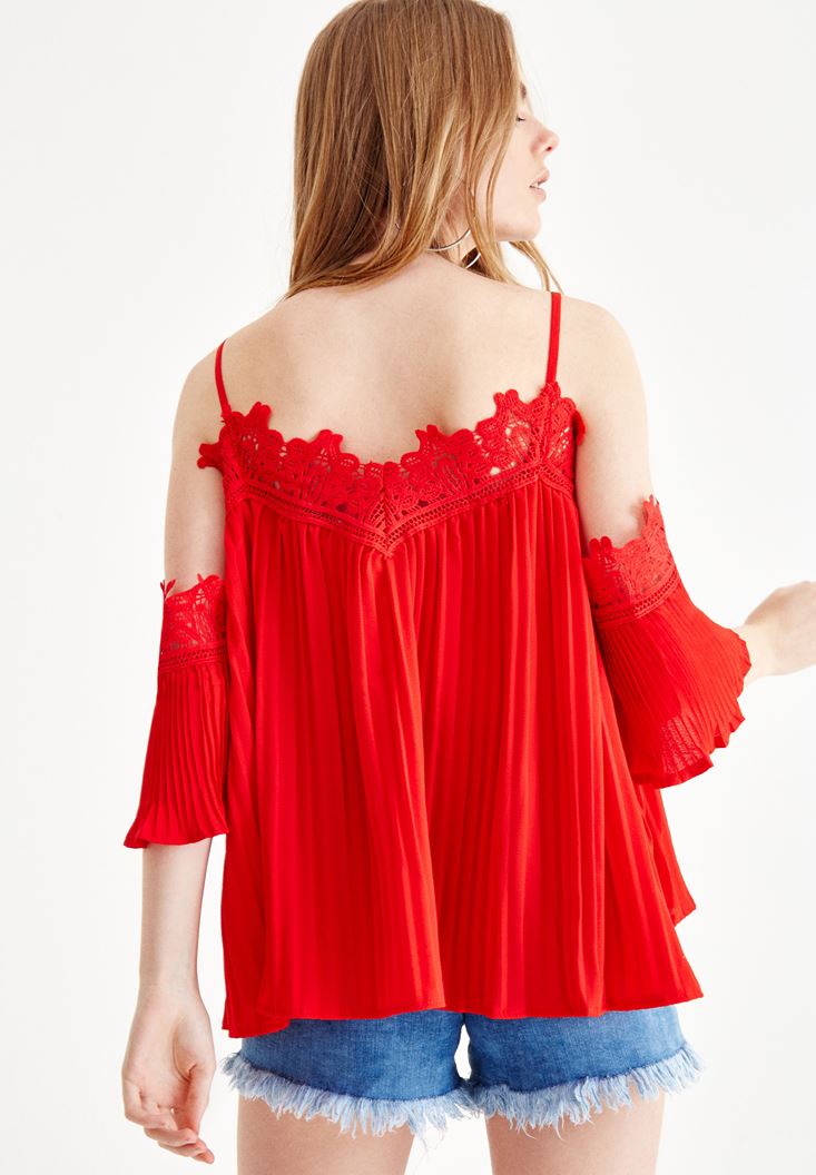 Pili Detayli Bluz modeli sahip oldugu dökümlü tasarimi ve zarif detaylari ile her zaman severek kullanacaginiz parçalardan birisi olacak. Derin V yaka kesimi ve düsük kol detayi ile dikkat çekici bir görünüme sahip plan bluz modelinde kullanilan dantel güpür detaylar tasarima hos bir hava kazandiriyor. Ince askilari ile zarafette bütünlügü ön plana çikaran bluz modelinin yaka kesiminde kullanilan dantel detay dikkat çekici bir dekolte olusturuyor. Dantel detaydan itibaren dökülen pilili rahat kumas ise tasarima hem enerji hem de siklik kazandiriyor. Dirsek hizasindan baslayan ve yaka tasarimi ile benzerlik gösteren kollar ise hos bir görünümü destekliyor. OXXO'nun enerjisini yansittigi bluz modelleri arasinda yer alan tasarim ile her zaman dikkat çekici bir siklik elde edebilirsiniz.