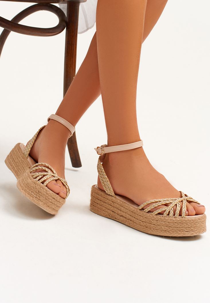 Bej Platform Topuklu Hasır Sandalet